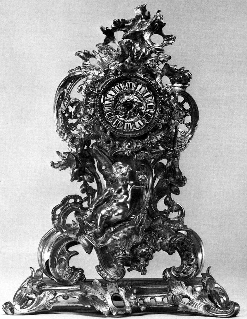 - NOTIZIE STORICO CRITICHE L'orologio si trovava originariamente tra gli arredi della Palazzina di Caccia di Stupinigi da dove fu inviato, nel 1922, a Palazzo Reale (Bolletta di carico n. 71, 2 agosto 1922). La rielaborazione di motivi rocailles delle decorazioni francesi del XVIII secolo, porta Enrico Colle datare l'opera alla metà dell'Ottocento (cfr. E. Colle, in Orologi negli arredi del Palazzo Reale di Torino e delle residenze sabaude, a cura di G. Brusa, A. Griseri e S. Pinto, catalogo della mostra, Torino 1988, scheda 94, p. 266).Il punzone di Hottot è presente in vari orologi delle residenze sabaude; in tutti i casi tranne in un orologio conservato al castello ducale di Agliè (inv. 285) compare insieme a quello di Japy Frères.. Farret era un noto orologiaio parigino attivo nello stesso periodo; il fatto però che il suo nome compaia sul collare della lunetta, fa pensare a Giuseppe Brusa che il suo intervento riguardi solo il quadrante (cfr. G. Brusa, in Ibid.)