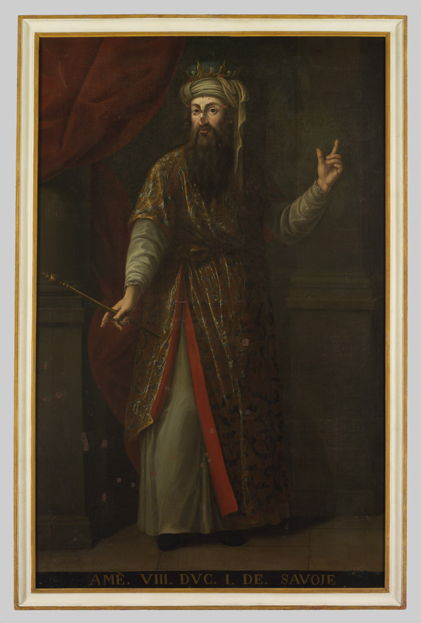 - NOTIZIE STORICO CRITICHE Il dipinto fa parte di un più ampio nucleo attualmente conservato presso il castello di Racconigi. La tela, uniforme per dimensioni alle altre della serie, raffigura Amedeo VIII. Legata agli altri dipinti dalla catena inventariale S.M., porta il numero S.M. 69, che trova corrispondenza nell 'inventario del 1879, in cui è registrata l'intera serie allora conservata al castello di Moncalieri, al primo piano, nella Galleria n. 70. In questo inventario la serie è composta da 87 quadri, documentati fin dai primi anni Settanta dell'Ottocento, da un altro inventario non datato, ma precedente al 1872, che li registra nella Galleria a ponente, dal numero 209 al 296: "Ottantasette quadri dipinti ad olio su tela rappresentante la Colezione (sic) dei R.li di Casa Savoja cioè da Beroldo a Maria Adelaide tutti con cornici colorite giallo Lunghezza 2,20 larghezza 1,18". Già nella prima metà dell'Ottocento Goffredo Casalis aveva avuto modo di visitare la "stupenda galleria, della lunghezza di centocinquanta passi; ai due lati della quale sono appesi i ritratti, in grandezza naturale, di tutti i Sovrani Sabaudi, ed accanto ad essi veggonsi pure le immagini delle loro Auguste Consorti". Tutti i quadri della serie, risultano, nell'inventario del 1879, scaricati nel gennaio del 1920, presso il castello di Racconigi, dove si trovano tuttora, ad eccezione di alcuni, non più presenti fin dagli anni Cinquanta del Novecento (non compaiono infatti nell'inventario del 1951). Il dipinto giunse dunque a Racconigi negli anni di Vittorio Emanuele III e della regina Elena: fin dall'inizio del secolo infatti i sovrani avevano intrapreso il "riordinamento del Reale Castello di Racconigi", poi continuato dal principe Umberto, come attesta l'acquisto già nel 1902, di alcuni "quadri antichi rappresentanti Principi e Principesse di Casa Savoia". Per quanto riguarda l'intera serie appare evidente che sia stata via via accresciuta con il trascorrere dei secoli, fino all'Ottocento. I ritratti, nella maggior parte dei casi, sono stati oggetto non solo di ripetuti restauri che li hanno interessati fino all'inizio del Novecento, ma hanno anche subito sensibili modifiche nel corso del tempo (ampliamenti, inserimento o variazione dell'iscrizione identificativa del personaggio ritratto, uniformizzazione dello sfondo), aspetti confermati dall'attuale campagna di indagini. Già Cesare Enrico Bertana, aveva individuato la presenza di una galleria di ritratti un tempo a Moncalieri, poi trasferita a Racconigi, non collegandola tuttavia a questa serie. Nuove ricerche hanno interessato una parte delle tele in questione in occasione della mostra tenutasi a Venaria (2007-2008), evidenziandone l'appartenenza alla galleria moncalierese sulla base di un elenco conservato presso la Biblioteca Reale, datato al 1780 (Misc. Patria, 46,24). Il documento riporta tuttavia solo i ritratti dei principi, da Beroldo a Carlo Emanuele III. Non vi compaiono invece le principesse, dato che induce a pensare per queste ultime a una provenienza da altre residenze. Il documento si riferisce probabilmente ai lavori necessari alla costituzione della galleria di ritratti voluta nell'ambito del generale rilancio del castello di Moncalieri, intrapreso da Vittorio Amedeo III, appena salito al trono (P. Astrua, 1987, p.88). Questo dipinto insieme a quelli di Cristina di Francia, Maria Giovanna Battista di Nemours, Francesco Giacinto, Carlo Emanuele II e Amedeo IX viene infatti citato nel diario di Carlo Felice fra i ritratti realizzati da Giovanni Panealbo per la Galleria di Moncalieri tra il 1786 e il 1788. Il restauro appena concluso ha non solo confermato affinità di carattere tecnico e dei materiali fra questo ritratto e quello di Amedeo IX , ma anche con i ritratti di Anna d'Orelans, Cristina Sulzbach, Polissena d'Assia, Elisabetta di Lorena e Francesca di Valois. L'iconografia di Amedeo VIII segue tuttavia il modello dei sovrani incisi nei medaglioni dell'"Histoire Généalogique de la Royal Maison De Savoye" di Samuel Guichenon pubblicata a Lione nel 1660 (p. 444), già utilizzato per realizzare anche le effigi dei sovrani più antichi di questa stessa serie. Nel castello di Racconigi esiste una replica a mezzo busto di questo ritratto (R 5616)