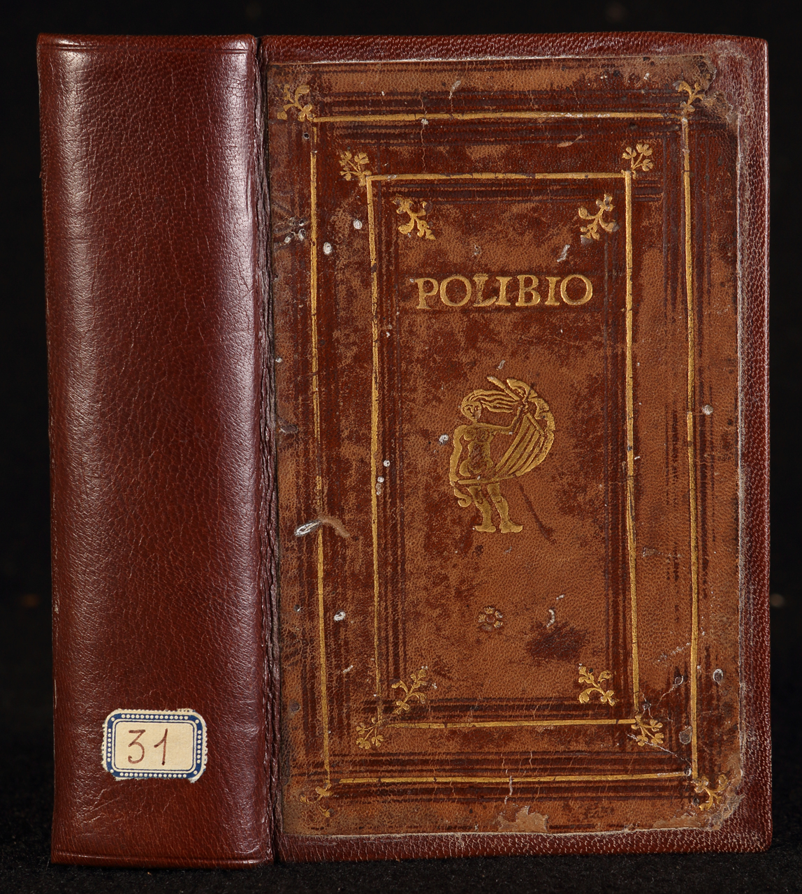 legatura di restauro con conservazione dei piatti originali in pelle su supporto in cartone decorata ai piatti con cornice di filetti a secco e in oro, accantonata esterna ed interna da fioroni dorati; al centro dei piatti raffigurazione della Fortuna sormontata, nel piatto superiore, da super libros con il nome dell'autore. Tagli dorati e cesellati
