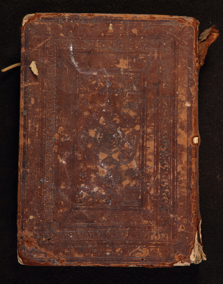 legatura rigida in pelle su supporto in cartone decorata ai piatti a secco con doppio riquadro di filetti raccordati, cornice a volute vegetali, altro doppio riquadro di filetti raccordati accantonato interno da ferro stilizzato vegetale; nello specchio, entro cerchio di filetti sagomati, composizione di elementi vegetali stilizzati. Tracce di legacci. Dorso a tre nervi doppi e rilevati. Unghie decorate a secco. Tagli blu con iscrizioni manoscritte in quello di piede