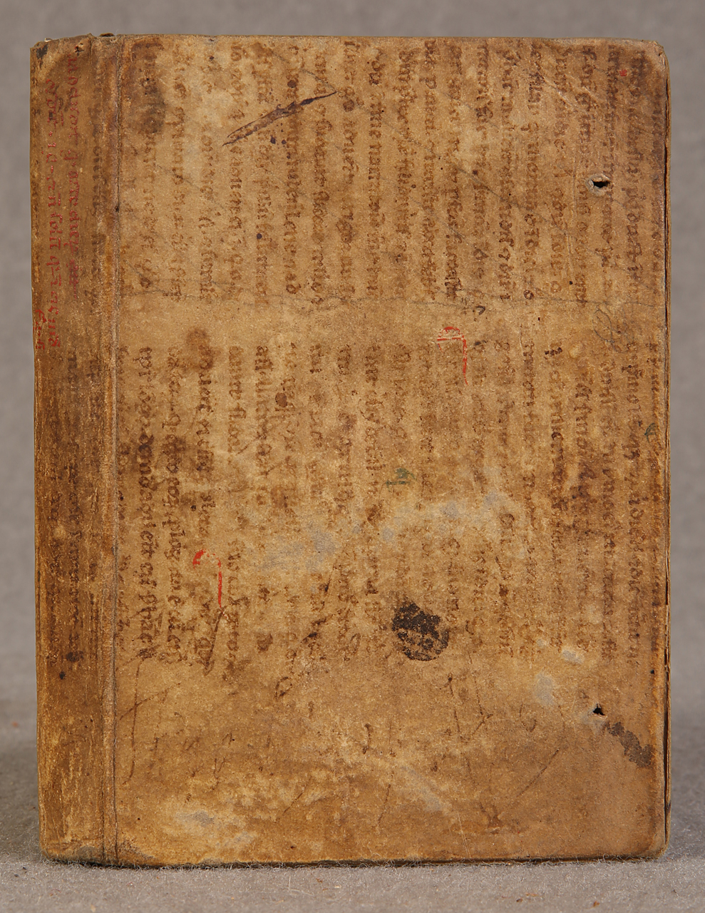 legatura rigida in pergamena di riuso su supporto in cartone. Dorso liscio. Tagli grezzi; nota manoscritta non leggibile sul taglio di piede. Note di possesso e altre note manoscritte sul foglio di guardia superiore; ex-libris e altre note manoscritte sul frontespizio. Resti di legacci ai piatti