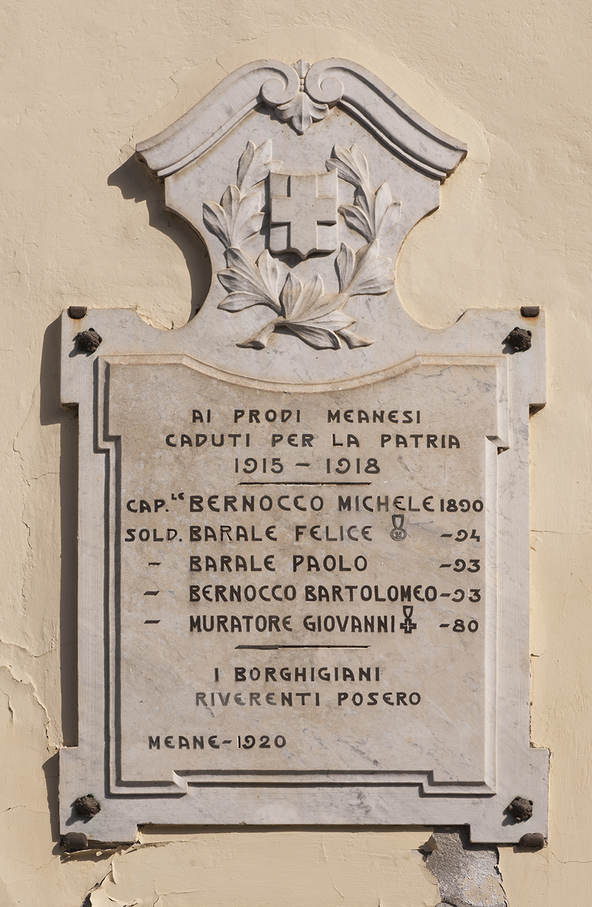 - ISCRIZIONI al centro - AI PRODI MEANESI / CADUTI PER LA PATRIA / 1915 - 1918 / CAP. LE BERNOCCO MICHELE 1890 / SOLD. BARALE FELICE -94 / - BARALE PAOLO -93 / - BERNOCCO BARTOLOMEO - 93 / - MURATORE GIOVANNI - 80 / I BORGHIGNANI / RIVERENTI POSERO / MEANE - 1920 - maiuscolo -