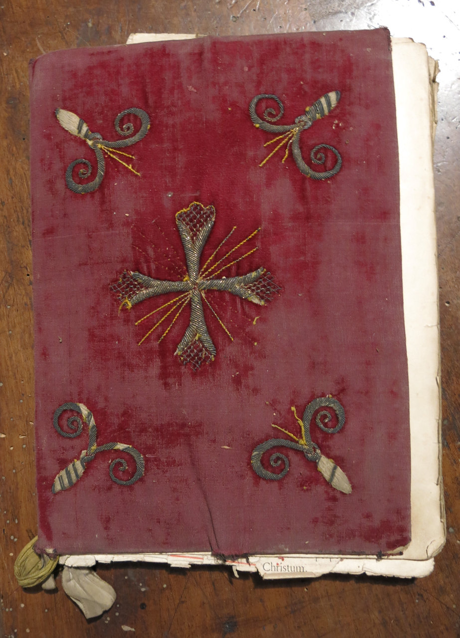 legatura rigida in velluto di cotone su supporto in cartone, decorata al piatto superiore con quattro motivi di volute agli angoli e croce raggiata al centro; al piatto inferiore è presente solo la croce raggiata. Dorso liscio. Tagli grezzi. Segnalibri in stoffa colorata