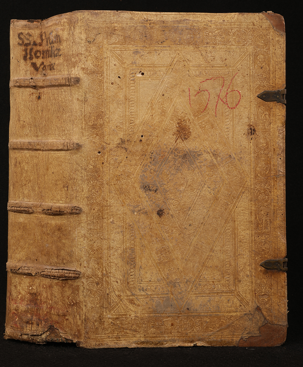 legatura rigida in pelle di scrofa su assi in legno bisellate internamente e con schiacciature ai piatti, decorata ai piatti a secco. Al piatto superiore cornice esterna di santi a mezzobusto in edicole, entro fasci di filetto, raccordata alla seconda cornice; seconda cornice con intreccio di corda in fasci di filetto; cornice dello specchio a losanga di tre cornici concentriche con mezzi busti in edicole, motivi vegetali, tondi con profili all'antica in motivi vegetali, divise da fasci di filetto; al centro dello specchio motivo vegetale. Al piatto inferiore cornice esterna di santi a mezzobusto in edicole, in fasci di filetto, raccordata alla seconda cornice; seconda cornice con medesimo motivo, in fasci di filetto, raccordata alla cornice dello specchio; al centro dello specchio due fasce parallele di candelabra tra fasci di filetto. Dorso a quattro nervi doppi rilevati e sottolineati; autore e titolo brevi manoscritti in prima casella. Tagli grezzi. Ex-libris manoscritto sul frontespizio. Graffe e contrograffe. Anno di edizione manoscritto in pastello rosso sul piatto superiore