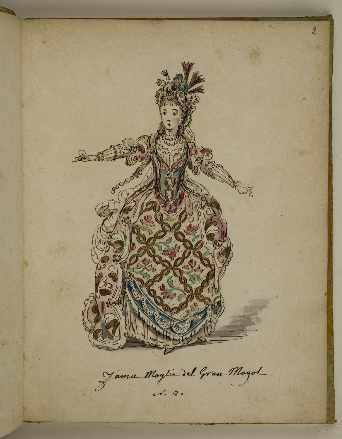 Disegno a inchiostro acquerellato di figurino di costume teatrale per il personaggio di "Zama Moglie del Gran Mogol", come da titolo. La figura indossa un abito riccamente decorato composto di una gonna ricamata con fiori e nastri, un panier, un copricapo piumato, una collana di perle e un paio di scarpette bianche