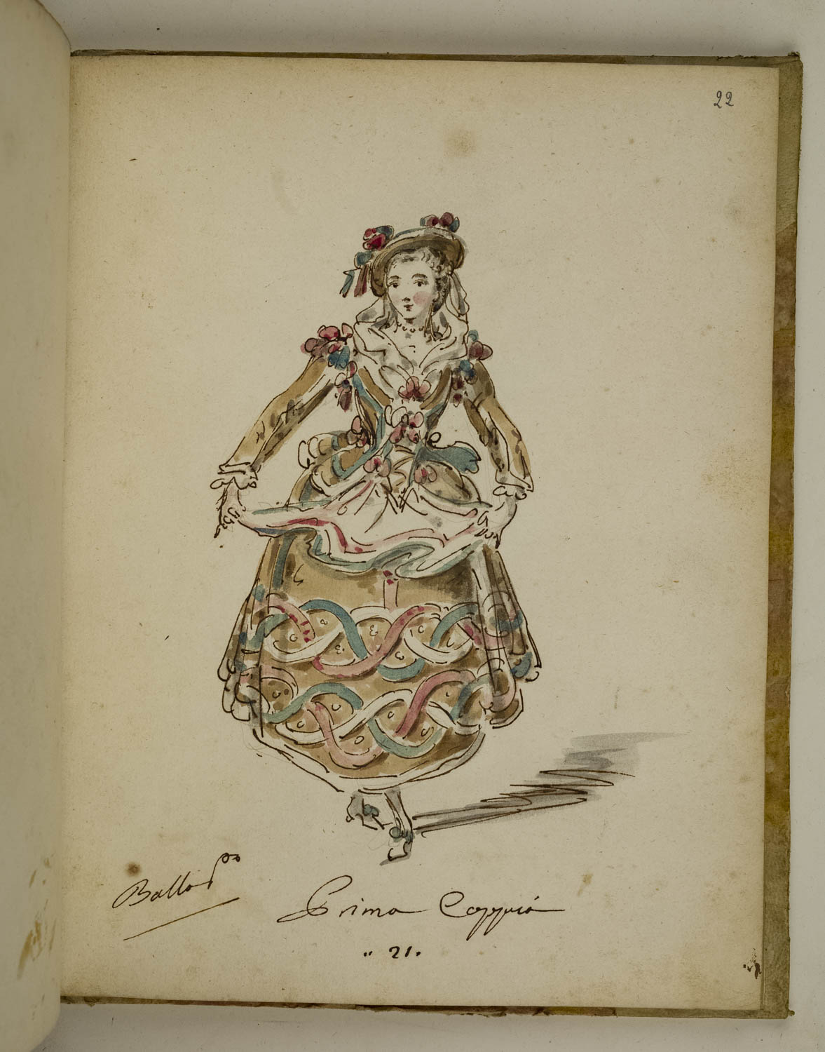 - NOTIZIE STORICO CRITICHE La ventunesima illustrazione del volume Storia Patria 1091.16 raffigura una comparsa della seconda opera seria andata in scena nel 1772 al Teatro Regio di Torino, "Tamas Kouli-Kan nell'India Dramma per musica da rappresentarsi nel Regio Teatro di Torino nel Carnovale del 1772". Rappresenta in particolare la contadina francese della prima delle due coppie di ballerini del "Ballo Primo: Pandurri Accampati", come da libretto (V. A. Cigna-Santi, 1772)