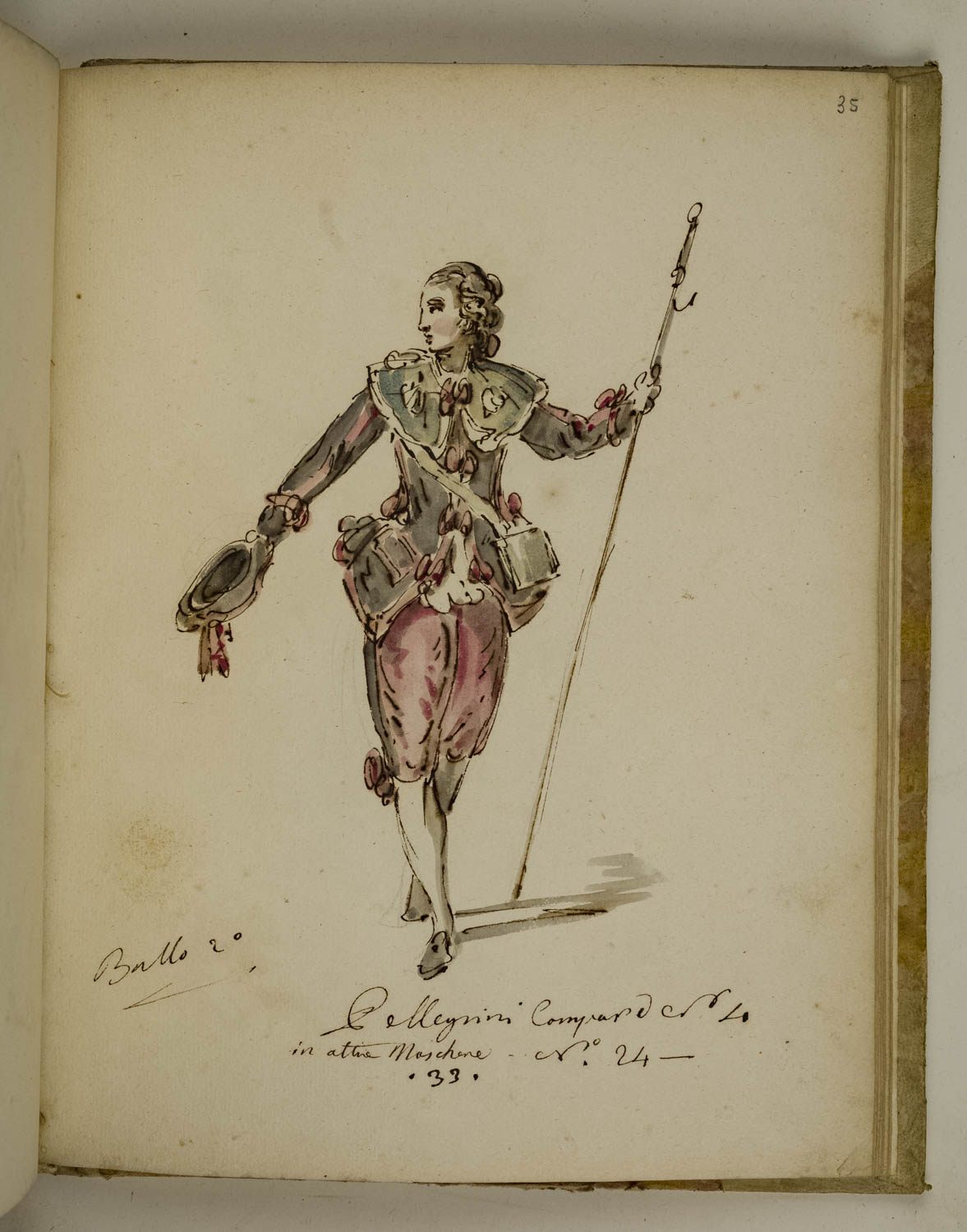 Disegno a inchiostro acquerellato di figurino di costume teatrale per un personaggio di "Pellegrini Comparse in altre Maschere”, come da titolo. La figura, in passo di danza, indossa un abito composto di una giacca grigia con fiocchi, un paio di pantaloni rossi, un paio di calze bianche con scarpette e porta a tracolla una sacca, in mano destra un cappello e nella sinistra un bastone