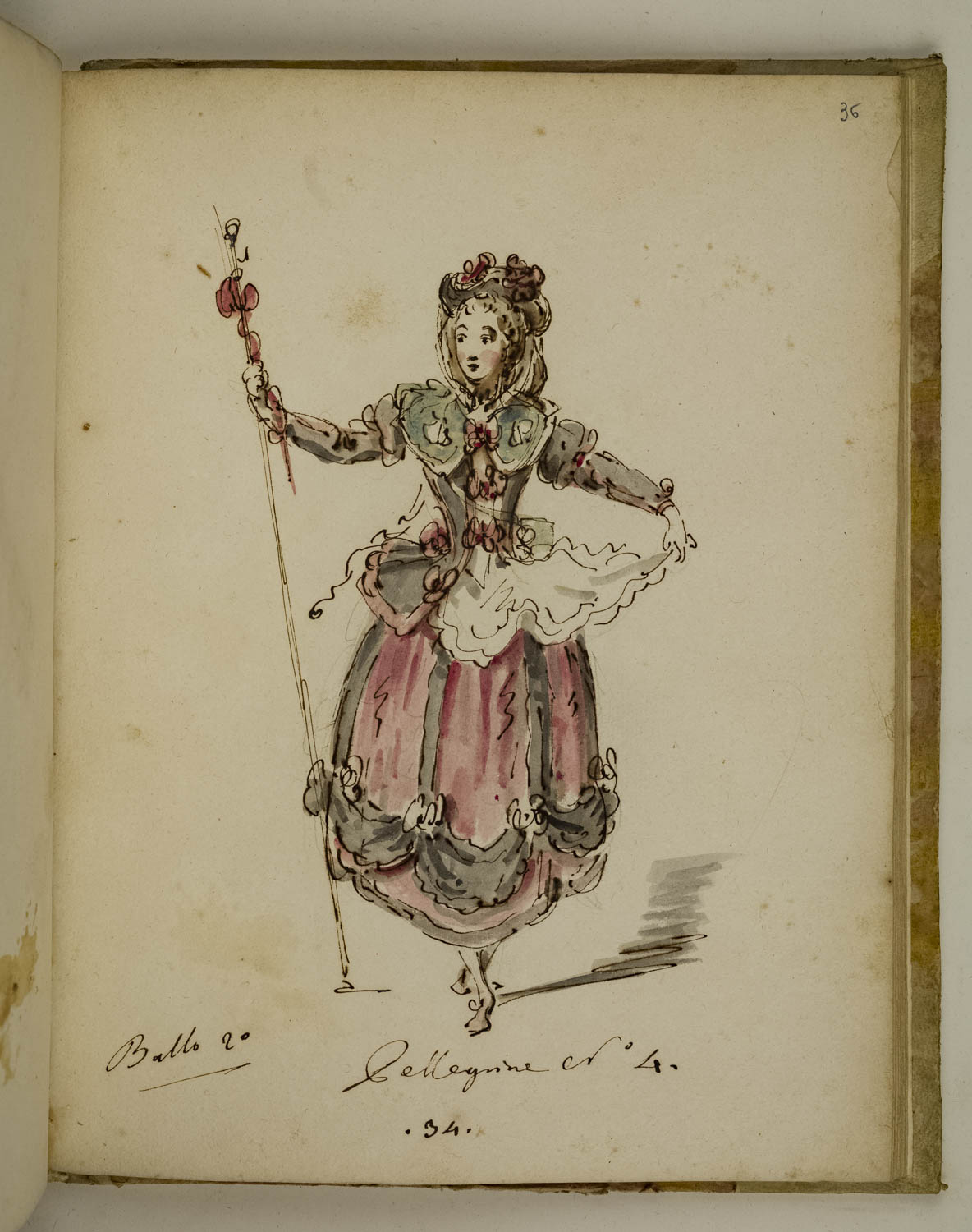 - NOTIZIE STORICO CRITICHE La trentaquattresima illustrazione del volume Storia Patria 1091.16 raffigura una comparsa della seconda opera seria andata in scena nel 1772 al Teatro Regio di Torino, "Tamas Kouli-Kan nell'India Dramma per musica da rappresentarsi nel Regio Teatro di Torino nel Carnovale del 1772". Rappresenta in particolare uno dei quattro pellegrini del "Ballo Secondo: La Mascherata sopra una Gran Piazza", come da libretto (V. A. Cigna-Santi, 1772)