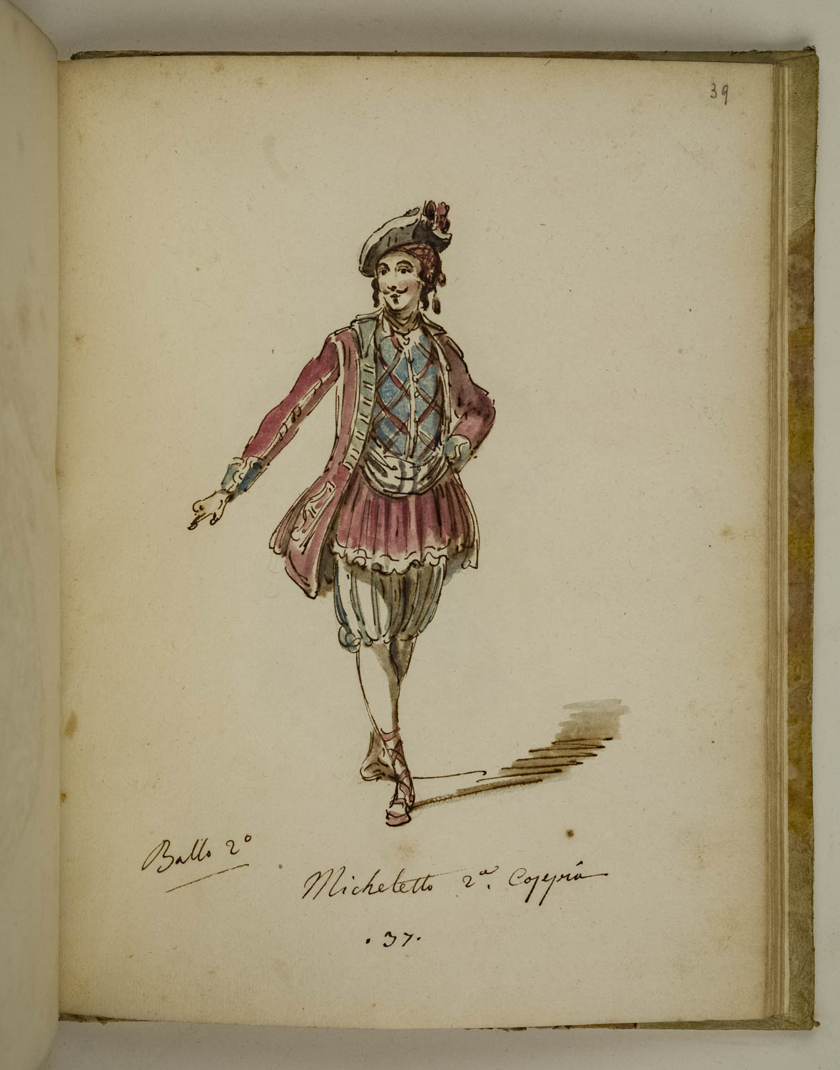 - NOTIZIE STORICO CRITICHE La trentasettesima illustrazione del volume Storia Patria 1091.16 raffigura una comparsa della seconda opera seria andata in scena nel 1772 al Teatro Regio di Torino, "Tamas Kouli-Kan nell'India Dramma per musica da rappresentarsi nel Regio Teatro di Torino nel Carnovale del 1772". Rappresenta in particolare un micheletto della seconda coppia del "Ballo Secondo: La Mascherata sopra una Gran Piazza", come da libretto (V. A. Cigna-Santi, 1772)
