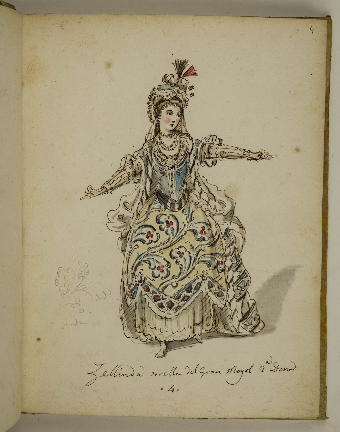 Disegno a inchiostro acquerellato di figurino di costume teatrale per il personaggio di "Zellinda Sorella del Gran Mogol seconda Donna", come da titolo. La figura indossa un abito composto di una gonna a fiori a fondo giallo, un corpetto azzurro, un velo, una collana di perle e un copricapo piumato. Accanto alla figura, in basso a sinistra, è presente un disegno a matita sottile che riprende il motivo decorativo vegetale dell'abito di Zelinda, con un'annotazione: "veste"