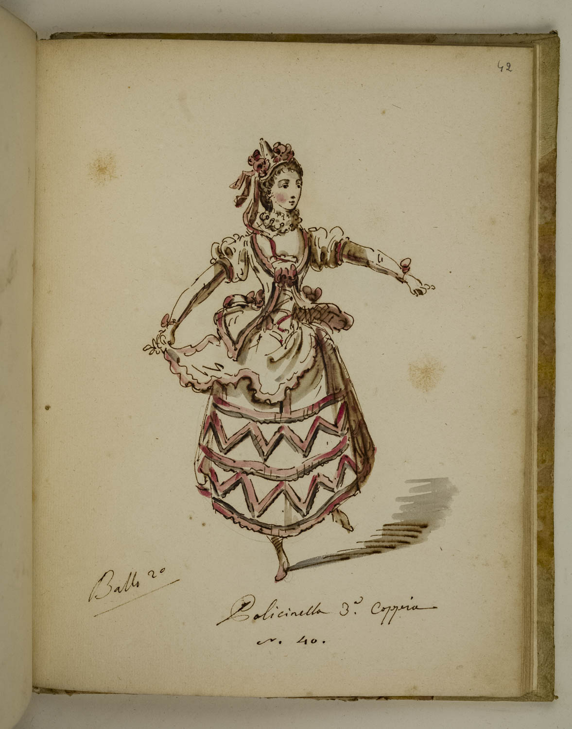 - NOTIZIE STORICO CRITICHE La quarantesima illustrazione del volume Storia Patria 1091.16 raffigura una comparsa della seconda opera seria andata in scena nel 1772 al Teatro Regio di Torino, "Tamas Kouli-Kan nell'India Dramma per musica da rappresentarsi nel Regio Teatro di Torino nel Carnovale del 1772". Rappresenta in particolare la fanciulla della terza coppia di Pulcinella del "Ballo Secondo: La Mascherata sopra una Gran Piazza", come da libretto (V. A. Cigna-Santi, 1772)