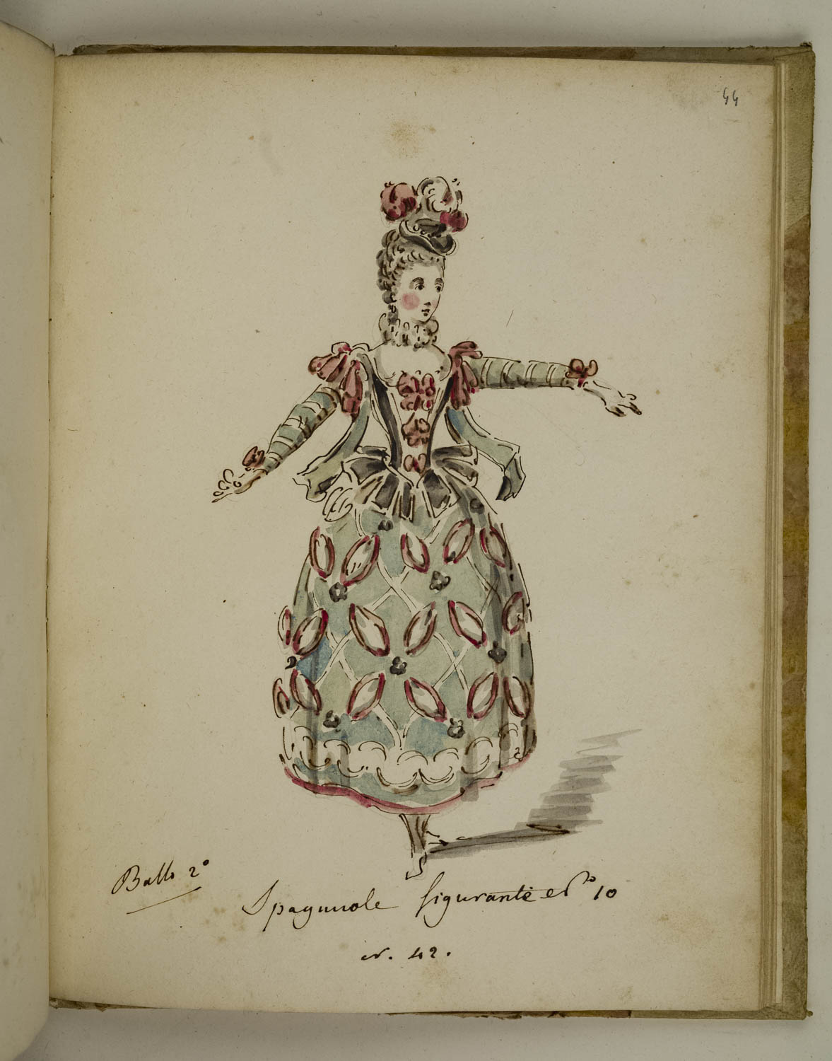 Disegno a inchiostro acquerellato di figurino di costume teatrale per un personaggio di "Spagnuola figurante”, come da titolo. La figura, in passo di danza, indossa un abito composto di una gonna a fondo verde con decorazioni rosse e bianche, un corpetto verde con nastri rossi, una piccola gorgiera, una collana di perle, un copricapo piumato con fiori rossi e un paio di scarpette bianche