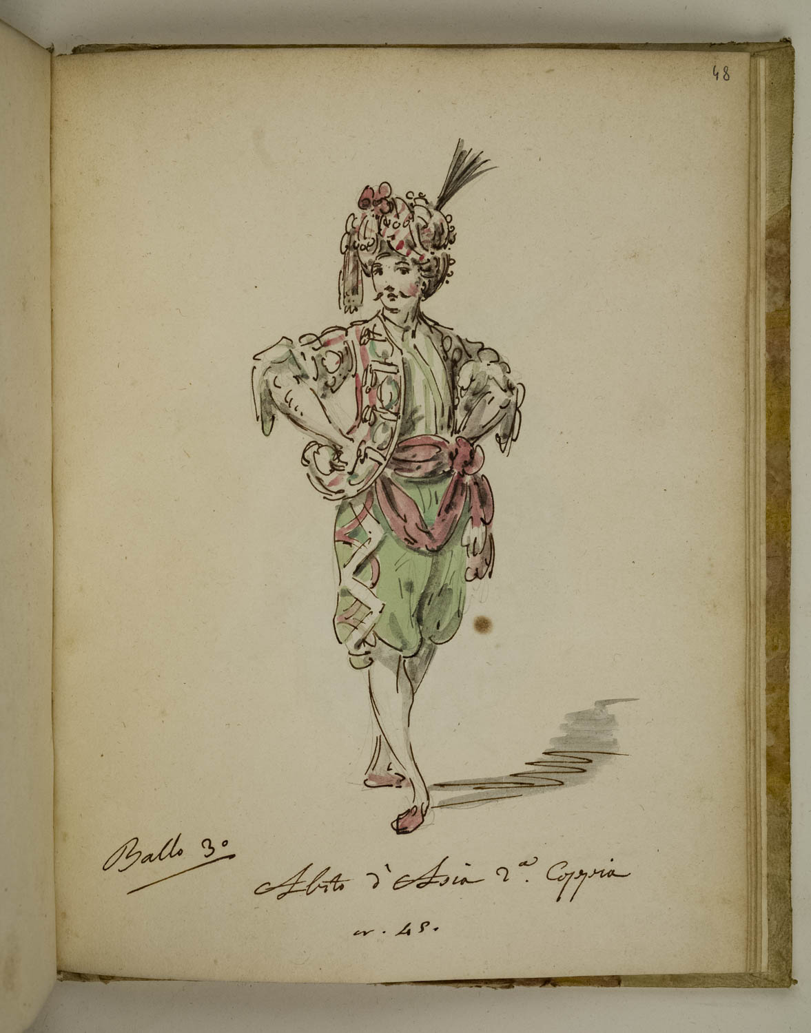 Disegno a inchiostro acquerellato di figurino di costume teatrale per un personaggio che indossa un “Abito d’Asia”, come da titolo. La figura, in passo di danza, indossa un abito composto di una camicia e un pantalone orientale verde, una giacca verde e rossa, una fascia in vita rossa, un turbante asiatico con perle e piume e un paio di scarpette rosse