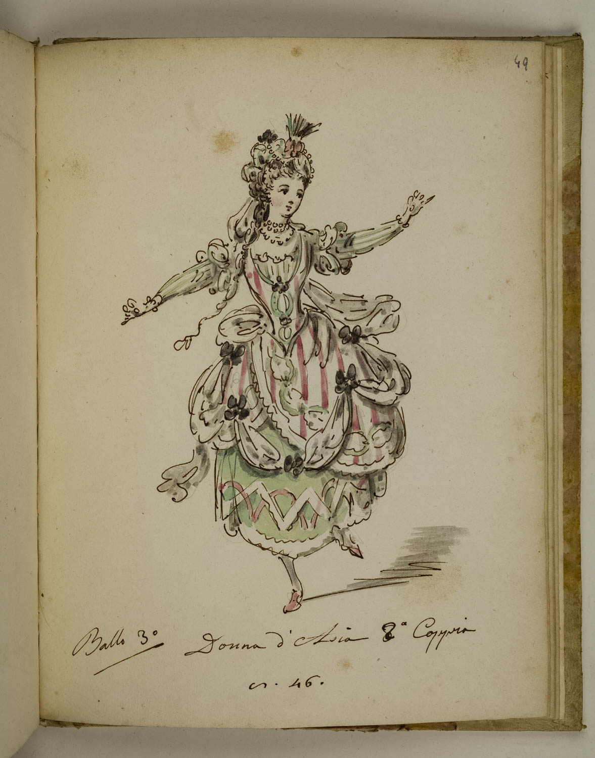 - NOTIZIE STORICO CRITICHE La quarantaseiesima illustrazione del volume Storia Patria 1091.16 raffigura una comparsa della seconda opera seria andata in scena nel 1772 al Teatro Regio di Torino, "Tamas Kouli-Kan nell'India Dramma per musica da rappresentarsi nel Regio Teatro di Torino nel Carnovale del 1772". Rappresenta in particolare una ballerina della seconda coppia di abitanti dell’Asia del "Ballo Terzo: Feste Persiane e Cinesi", come da libretto (V. A. Cigna-Santi, 1772)