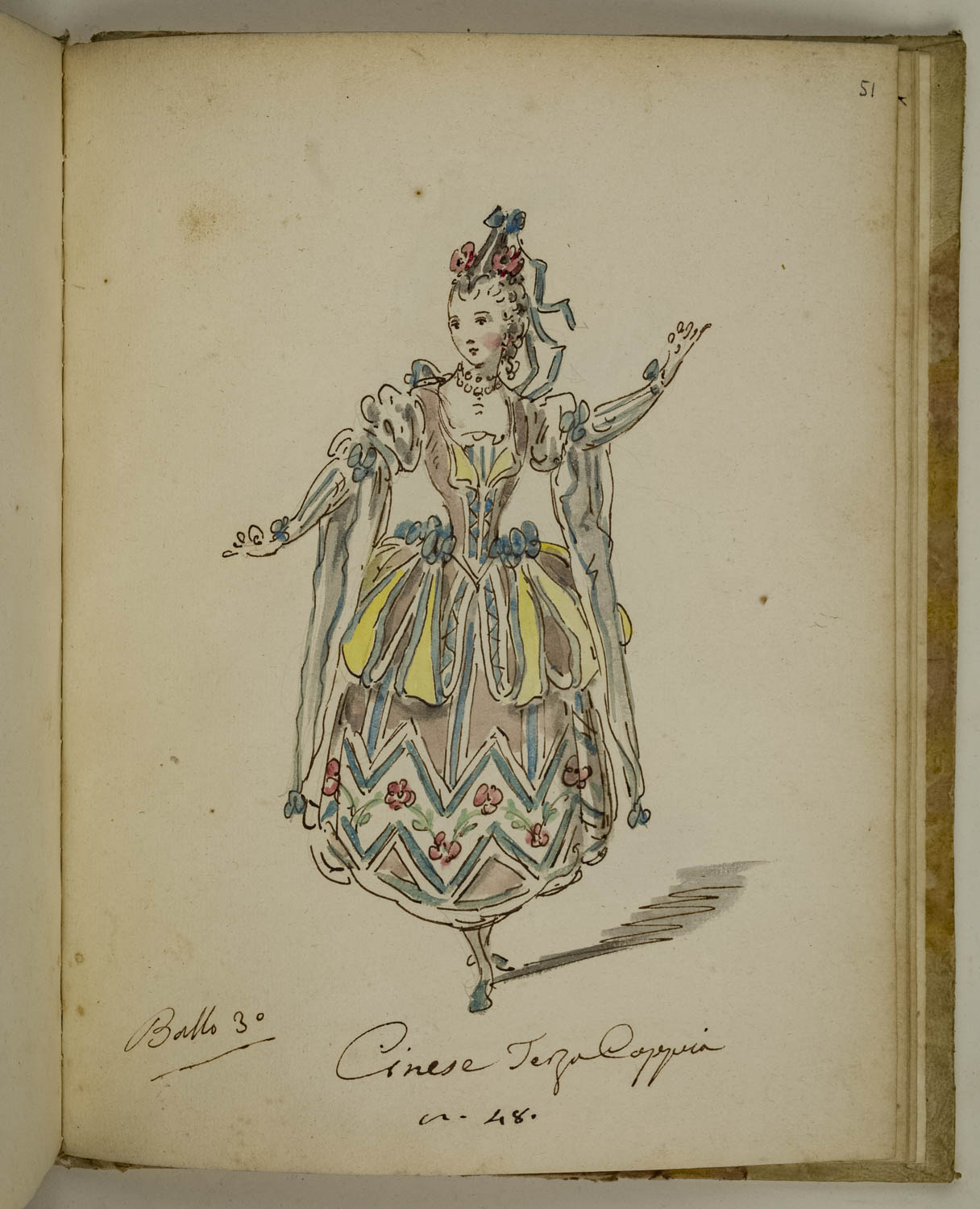 - NOTIZIE STORICO CRITICHE La quarantottesima illustrazione del volume Storia Patria 1091.16 raffigura una comparsa della seconda opera seria andata in scena nel 1772 al Teatro Regio di Torino, "Tamas Kouli-Kan nell'India Dramma per musica da rappresentarsi nel Regio Teatro di Torino nel Carnovale del 1772". Rappresenta in particolare una ballerina della terza coppia di cinesi del "Ballo Terzo: Feste Persiane e Cinesi", come da libretto (V. A. Cigna-Santi, 1772)