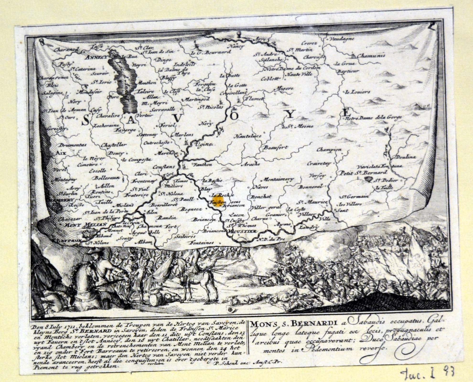 Mons. S. Bernardi a Sabaudis occupatus, Gallique longe lateque fugati ex locis, propugnaculis et arcibus quae occupaverant; Duce Sabaudiae per montes in Pedemontium reverso. pianta della Savoia