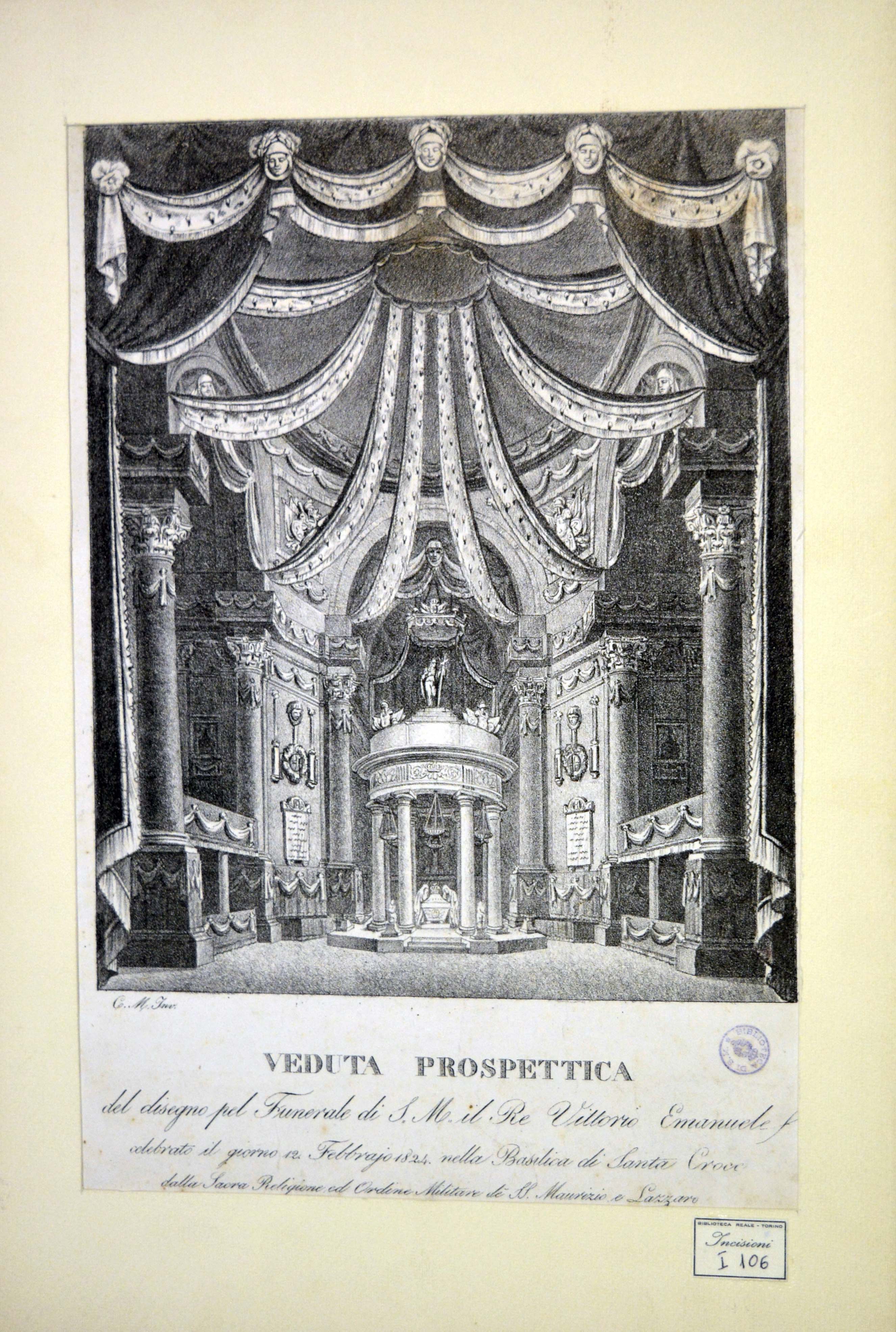 Veduta Prospettica del disegno pel Funerale di Sua Maestà il Re Vittorio Emanuele I celebrato il giorno 12 Febbraio 1824 nella Basilica di Santa Croce dalla Sacra Religione ed Ordine Militare de' SS. Maurizio e Lazzaro. veduta prospettica dell'altar maggiore della basilica di Santa Croce con l'apparato funebre per le esequie del re Vittorio Emanuele I, morto a Moncalieri il 10 gennaio 1824, celebrato il 12 febbraio 1824