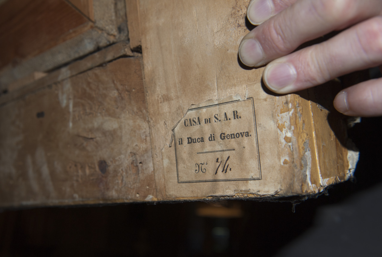 - ISCRIZIONI sul telaio in basso a sinistra, su etichetta rettangolare mutila prestampata in nero - CASA DI S.A.R./ il Duca di Genova// n. 74 - stampatello maiuscolo, stampatello minuscolo, nume - a timbro nero -