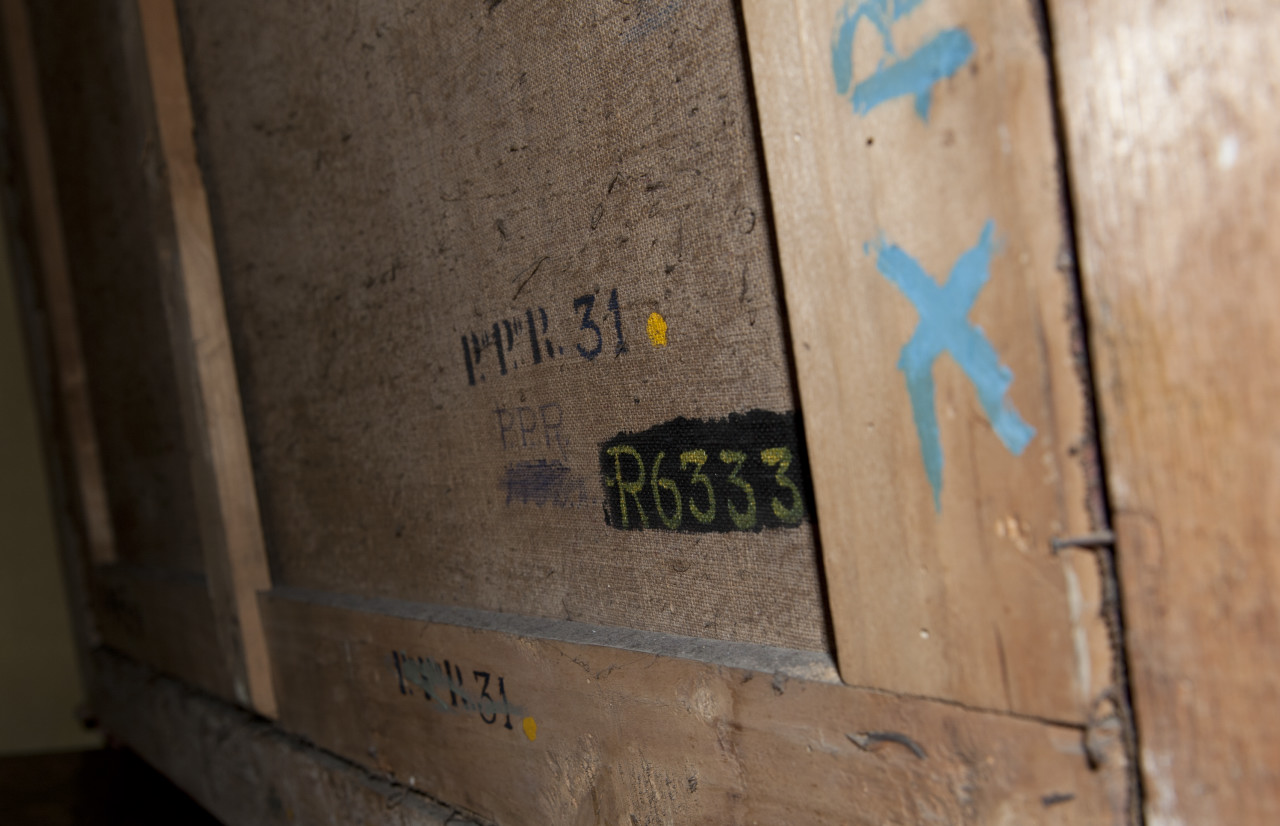 - ISCRIZIONI sul retro, sul bordo laterale del telaio - X.R. 14 - stampatello - a impressione nero -