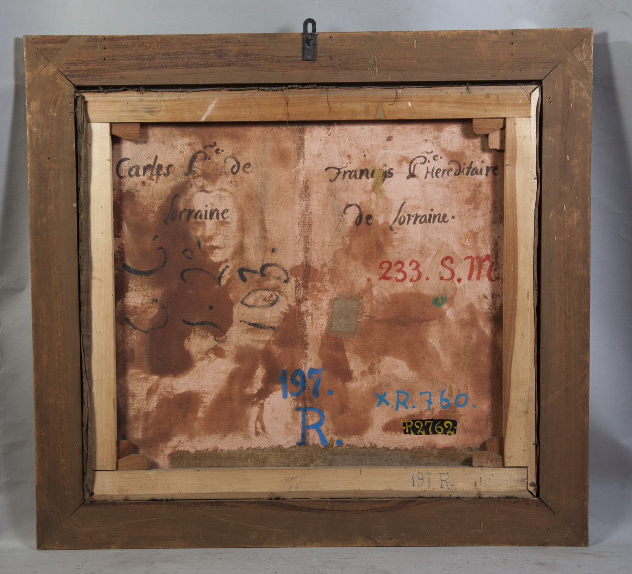 Doppio ritratto maschile a 1/2 figura, teste leggermente volte verso destra. La figura di sinistra ritrae Francesco di Lorena con parrucca chiara e corazza impreziosita da finiture in oro e dal Toson d'Oro. Porta una camicia bianca e un manto rosso. Tiene la mano destra al fianco con il bastone del comando, mentre la sinistra è appoggiata sull'elmo posato a lato. La figura di destra ritrae Carlo di Lorena in età giovanile, con corsaletto di corazza, sciarpa gialla ai fianchi e spada a sinistra. Sotto la corazza s'intravede la manica dell'abito violaceo e la camicia chiara. La figura è rappresentata nell'atto di indicare l'altra con la mano sinistra. Cornice intagliata con vari motivi ornamentali e dorata