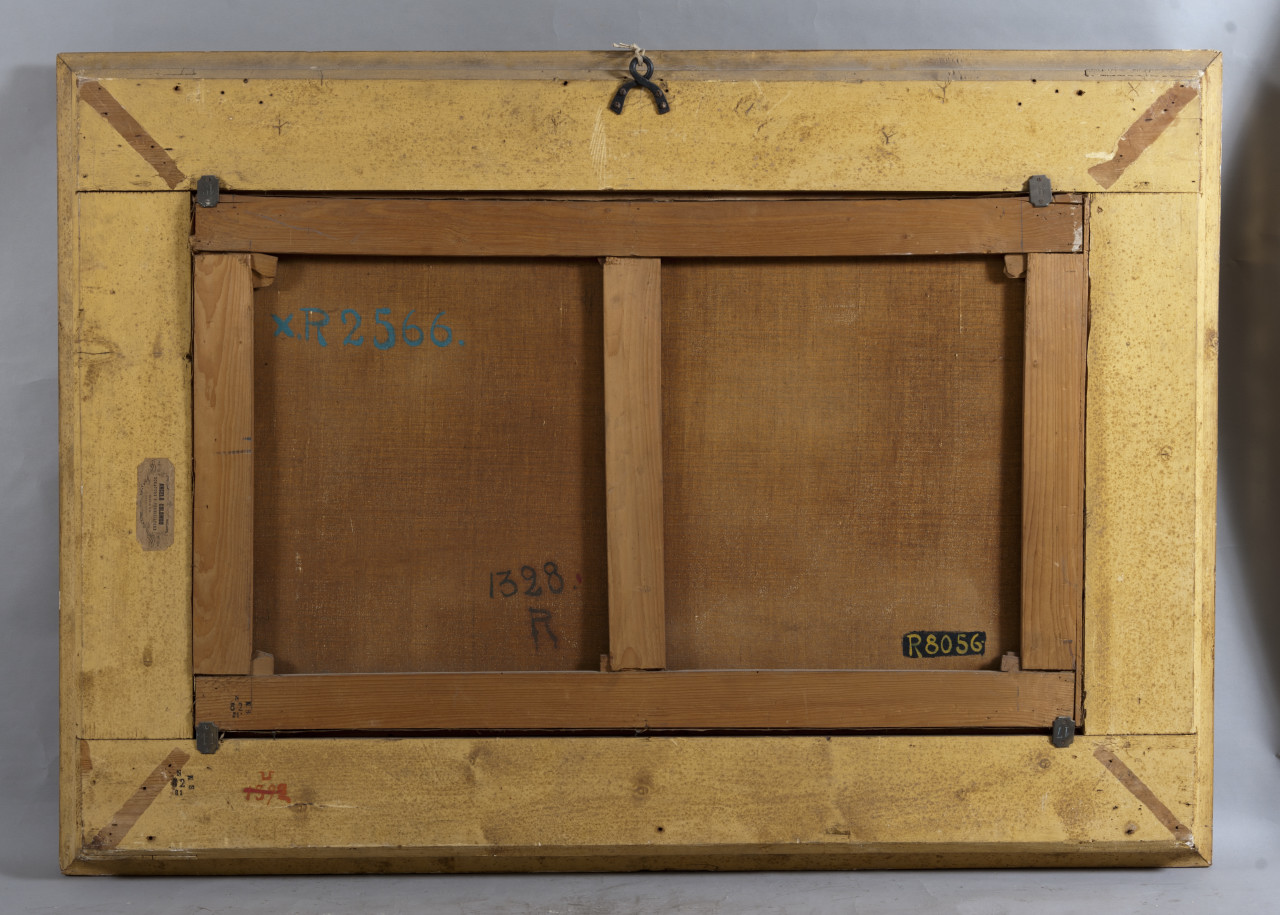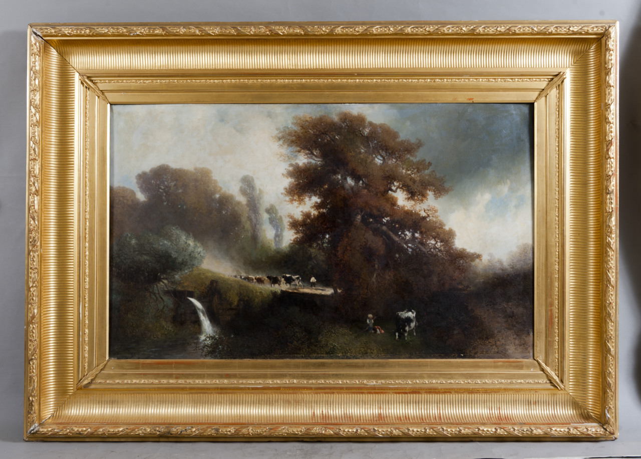 Il dipinto raffigura un paesaggio boschivo popolato dalla presenza di bestiame e di due pastori. Sulla sinistra è rappresentata una fonte. Cornice di legno dorata e decorata, sulla quale si evidenziano alcune rotture sugli angoli e lacune del colore