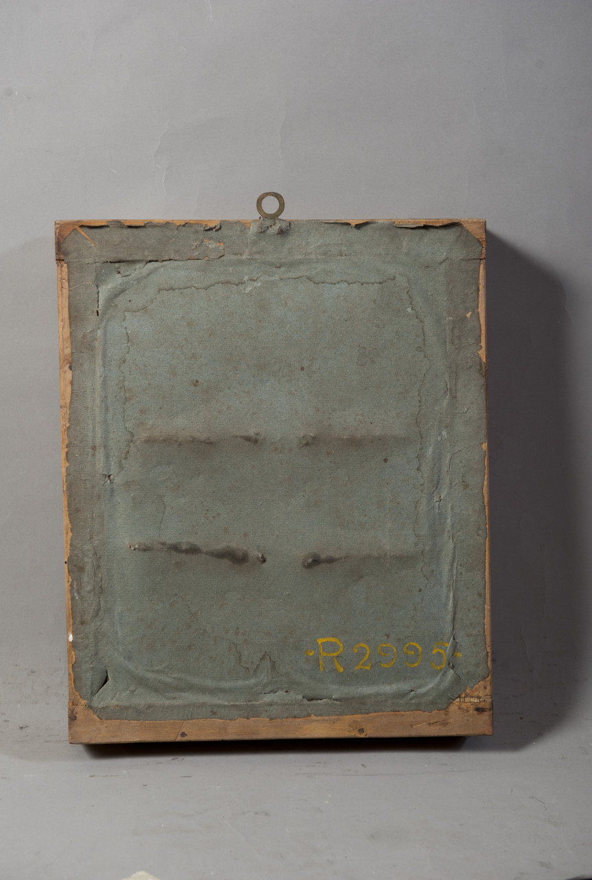 Ritratto maschile a 1/2 busto di profilo, testa volta a destra. Indossa la divisa militare con spalline decorata e nodi sabaudi e insignite del motto "FERT". Porta alcune decorazioni miltari tra cui la spilla dell'Ordine della SS. Annunziata. Cornice di legno dorato con ornati in gesso sul profilo più interno e munita di vetro. Alcuni fori di tarlo sulla cornice