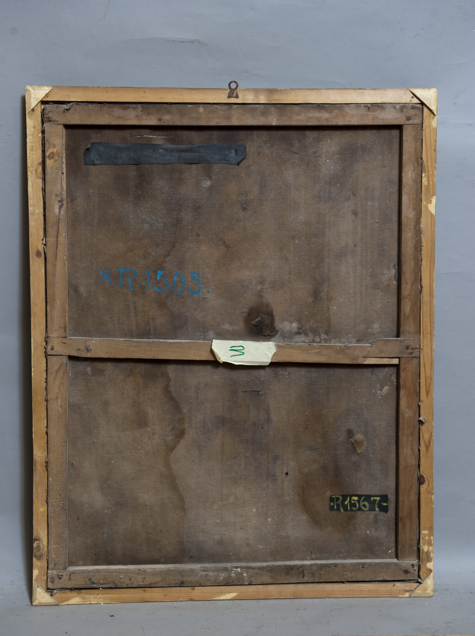 Dipinto a olio su tela di formato rettangolare, con cornice in legno intagliato, scanalato e dipinto di giallo senape. Una nobildonna ignota, a busto intero, è avvolta in una ricca veste rossa con ornati in filato metallico argento; la sopravveste è invece scura, con ornati in filato metallico oro. L'ampio colletto in pizzo bianco contorna la scollatura sul petto. Numerosi i gioielli che sfoggia, in perle e pietre preziose. La mano sinistra, con l'anulare inanellato, strige un fazzoletto. A destra della figura compare una tenda rossa, scostata