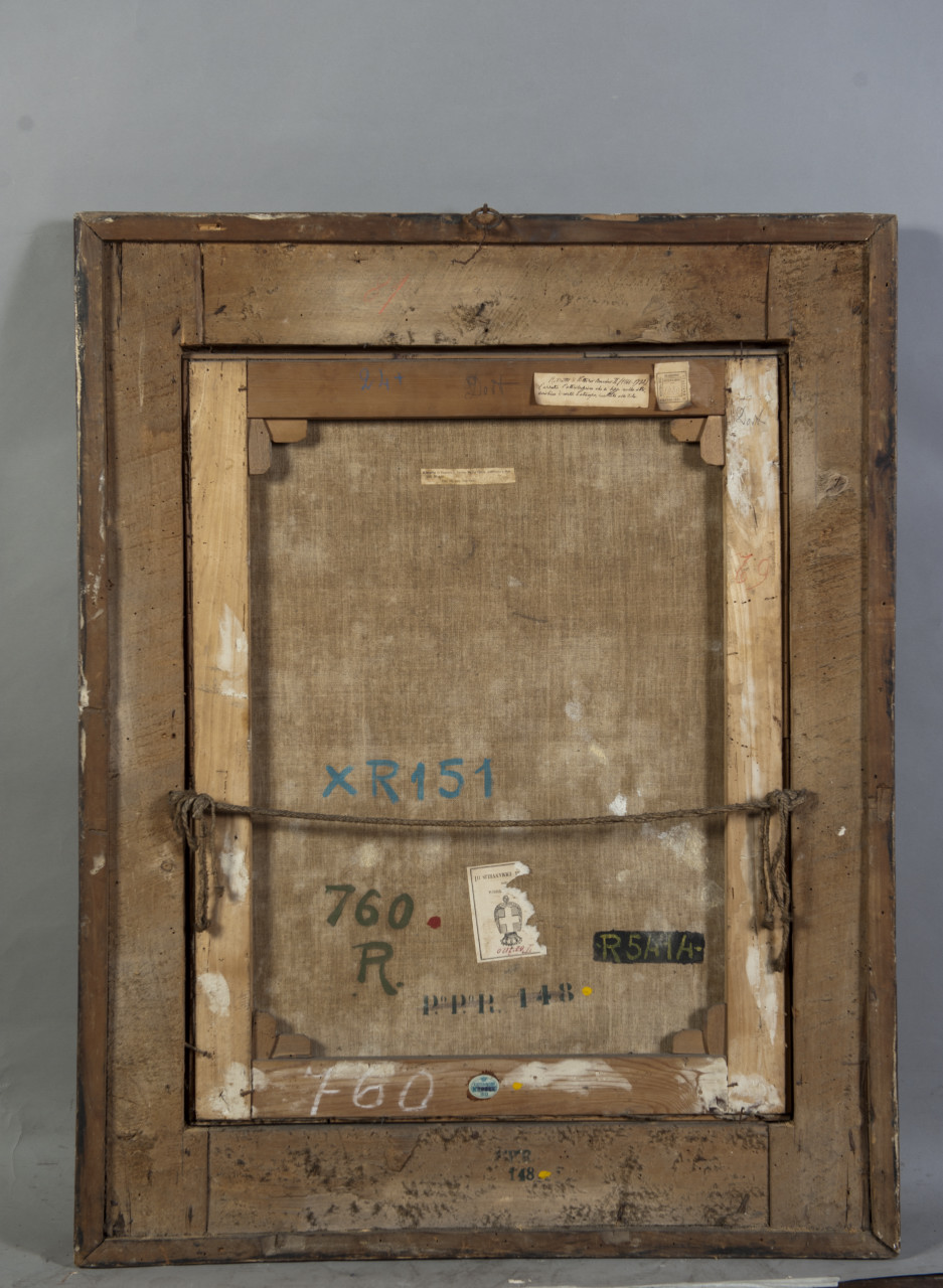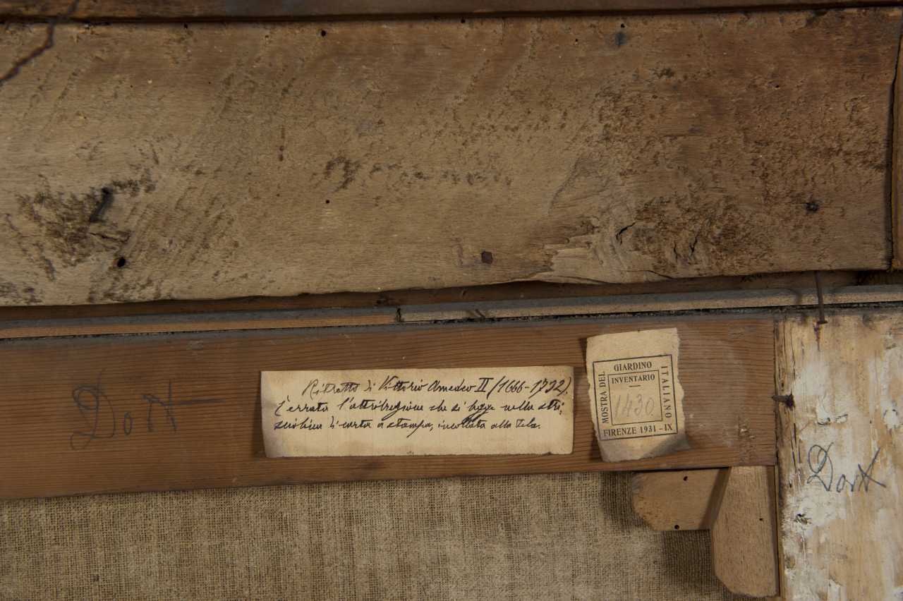 Dipinto ad olio su tela di formato rettangolare con cornice in legno intagliato, dipinto e dorato. Vittorio Amedeo II è ritratto a 1/2 figura, testa leggermente a sinistra, in corazza adorna del gran collare dell'O.SS.A. e cravatta di pizzo bianco, sotto il manto rosso operato a nodi di Savoia e foderato d'ermellino