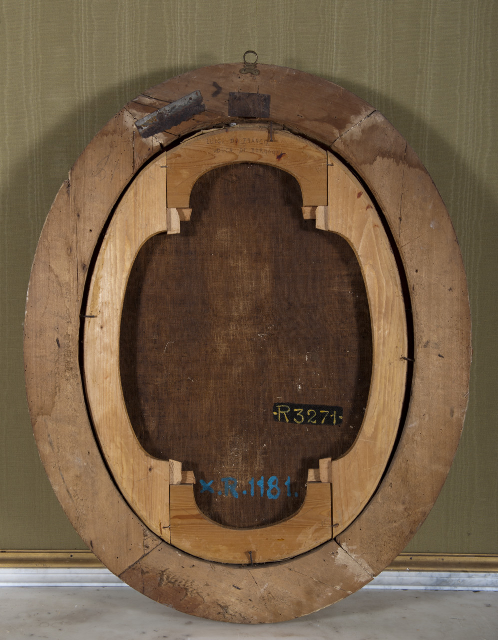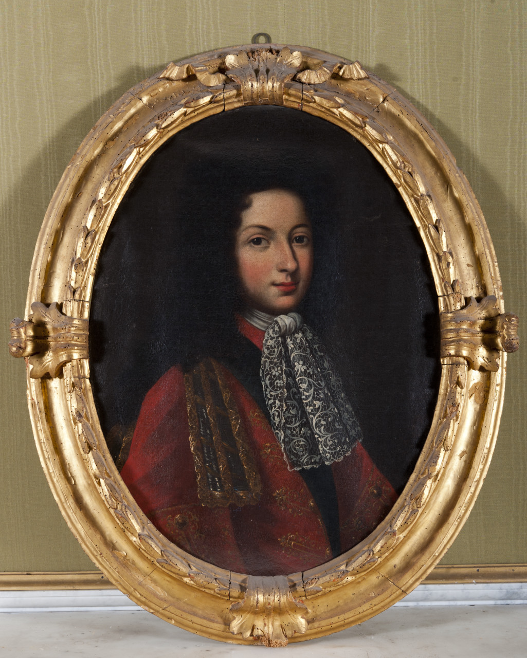 Il personaggio è rappresentato a mezzo busto, con taglio poco al di sotto della spalla. Il corpo è orientato di lieve tre quarti, il viso, sereno e giovanile, è rivolto verso l’osservatore. Porta una parrucca con scriminatura centrale e boccoli che discendono sino alle spalle. Indossa una camicia, jabot di pizzo e una veste da camera con ampie maniche finemente ricamate, analogamente alle asole per la chiusura dell’abito. Sulla sinistra si scorge lo schienale di una sedia sulla quale il personaggio è seduto. Sfondo neutro di colore bruno. La tela è conservata entro una cornice di formato e luce ovale in legno intagliato, scolpito e dorato. Tipologia a gola. Battuta liscia; fascia interna ornata con motivo continuo a fogliette, centrale liscia ed esterna modanata. In corrispondenza delle porzioni mediane di ciascun lato è intagliata una foglia di acanto stilizzata e lievemente accartocciata. Da quella posta superiormente si sviluppano due elementi a nastro piatto, disposti simmetricamente