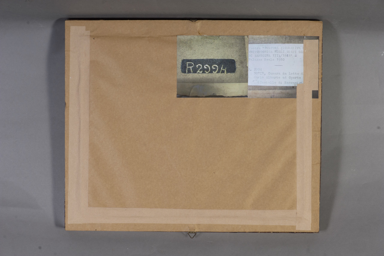 - NOTIZIE STORICO CRITICHE L’acquerello fa parte, molto probabilmente, di una serie di disegni preparatori, non rintracciati, eseguiti da Enrico Gonin in occasione del suo soggiorno ad Oporto per la realizzazione delle tavole da incidere commissionategli subito dopo la morte del sovrano, nel 1849, relative ai luoghi del suo soggiorno d’esilio ad Oporto, come si deduce anche dalla cornice e dalle didascalie inserite al di sopra e al di sotto della scena. Nel gruppo di litografie, principalmente vedute della città portoghese ed esterni del parco che circondava la villa nella quale si era ritirato Carlo Alberto, fanno parte anche un paio di immagini, dettagliatissime, che mostrano gli interni della residenza. In quella in esame è raffigurata la camera da letto del sovrano, contraddistinta, come del resto anche quella che si era fatto allestire in Palazzo Reale a Torino, da una estrema semplicità e razionalità dell’arredo. Benché in questo caso non si tratti dei lavori dell’équipe del ebanisti di corte, coordinata da Gabriele Capello detto il Moncalvo, il gusto biedermaier e gli accenti classicisti del mobilio della villa portoghese appare piuttosto vicino in termini di scelte alla moda. Carlo Alberto nacque nel 1798, a Torino, da Carlo Emanuele, sesto principe di Carignano, e da Maria Cristina di Sassonia-Curlandia. Dalla metà del quarto decennio dell’Ottocento, avviò un processo di riorganizzazione dell’amministrazione del Regno, con esiti importanti soprattutto sul fronte giuridico, ma anche su quello economico. Un nuovo piano di riforme venne avviato nel 1847; culminò l’anno successivo con la concessione dello Statuto Albertino, carta costituzionale del Regno di Sardegna. Nel 1848, l’intervento delle truppe sarde a sostegno della insurrezione milanese contro il governo asburgico fu il primo passo per il mutamento dell’assetto sancito dal Congresso di Vienna in Italia che avrebbe portato, attraverso le guerre d’indipendenza, all’unificazione italiana sotto il governo sabaudo. Questa prima fase del conflitto non sortì gli esiti sperati e l’esercito austriaco recuperò rapidamente tutte le posizioni in Lombardia. Nel 1849, dopo la sconfitta di Novara, Carlo Alberto abdicò in favore del figlio Vittorio Emanuele, ritirandosi in esilio ad Oporto, ove morì pochi mesi dopo