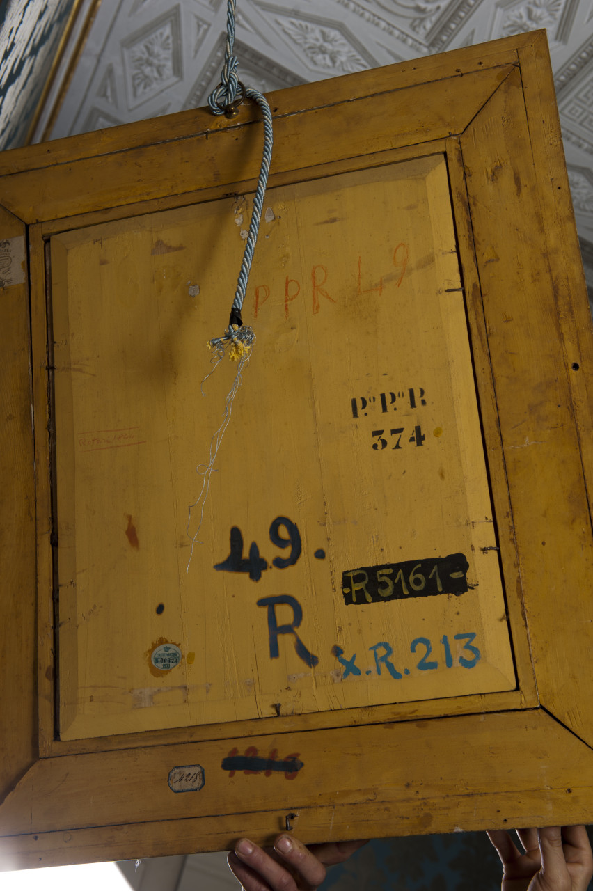 - NOTIZIE STORICO CRITICHE Secondo quanto attestato da un’iscrizione presente sul retro della tavola, l’opera dovrebbe risalire all’anno 1844 ed essere il lavoro di un pittore dal cognome “Rotari”. La cultura accademica esibita dal dipinto, la ricca cornice con stemmi sabaudi, appositamente realizzata, come si deduce dalla simbolica presenza dell’agnello in basso, e la sua collocazione nell’appartamento destinato a Carlo Alberto nel Castello rendono del tutto plausibile la cronologia del dipinto. Più complesso è definire la fisionomia dell’autore, dal momento che non compare nei repertori noti alcun pittore attivo alla metà del XIX secolo con questo cognome. Tuttavia il nome Rotari evoca il nome di un illustre maestro di origini veronesi noto su scala internazionale alla metà del secolo precedente, il pittore Pietro (Verona, 1707-San Pietroburgo, 1762). Questi ebbe un figlio di nome Vincenzo (1753-1831) che fu incisore e pittore dilettante. Non pare da escludere che il Rotari in questione possa essere un discendente, forse il figlio di quest’ultimo. Diversamente, si potrebbe ipotizzare a un errore di trascrizione del nominativo oppure che non si tratti di un artista professionista, ma di un personaggio della corte di Carlo Alberto, o venuto in contatto con il sovrano, che fu pittore dilettante. Dal punto di vista iconografico l’opera appare del tutto rispondente al dettato evangelico e rispettosa delle convenzioni di rappresentazione pittorica di età moderna, sebbene la soluzione della raffigurazione del volto di Cristo con lo sguardo rivolto verso l’osservatore appaia meno consueta rispetto a quella che lo privilegia sofferente con il capo reclinato oppure sollevato verso l’alto, rivolto verso il divino