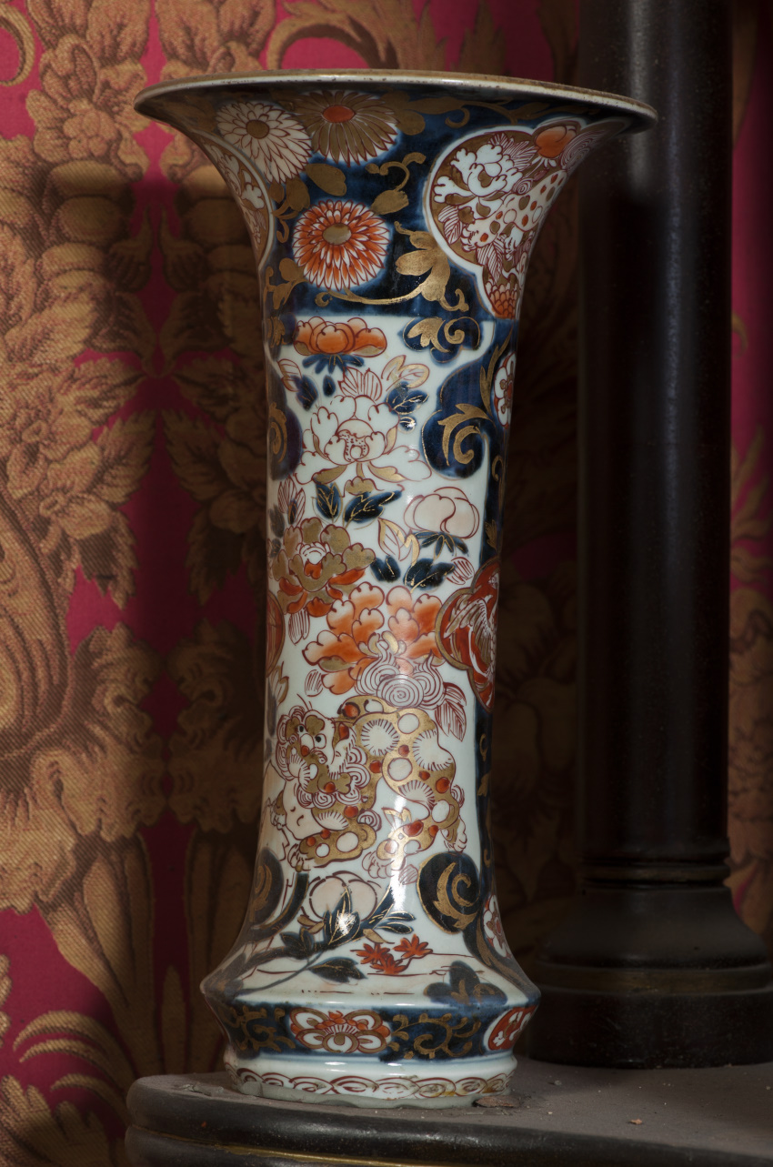 Vaso giapponese a tromba, di porcellana a smalti del tipo "Imari" di colore blu cobalto sotto coperta e varie tonalità di rosso ferro, oro e tocchi di nero sovra coperta. Nella riserva sul corpo del vaso e in quelle della spalla sono rappresentati leoni cinesi fra rocce e fiori di peonie. Sul resto del vaso la decorazione è a crisantemi o altre specie floreali su fondo blu. All'interno del vaso sono dipinti in rosso e oro tralci di crisantemo e di peonia. Il piede è decorato da una greca con motivo a spirale