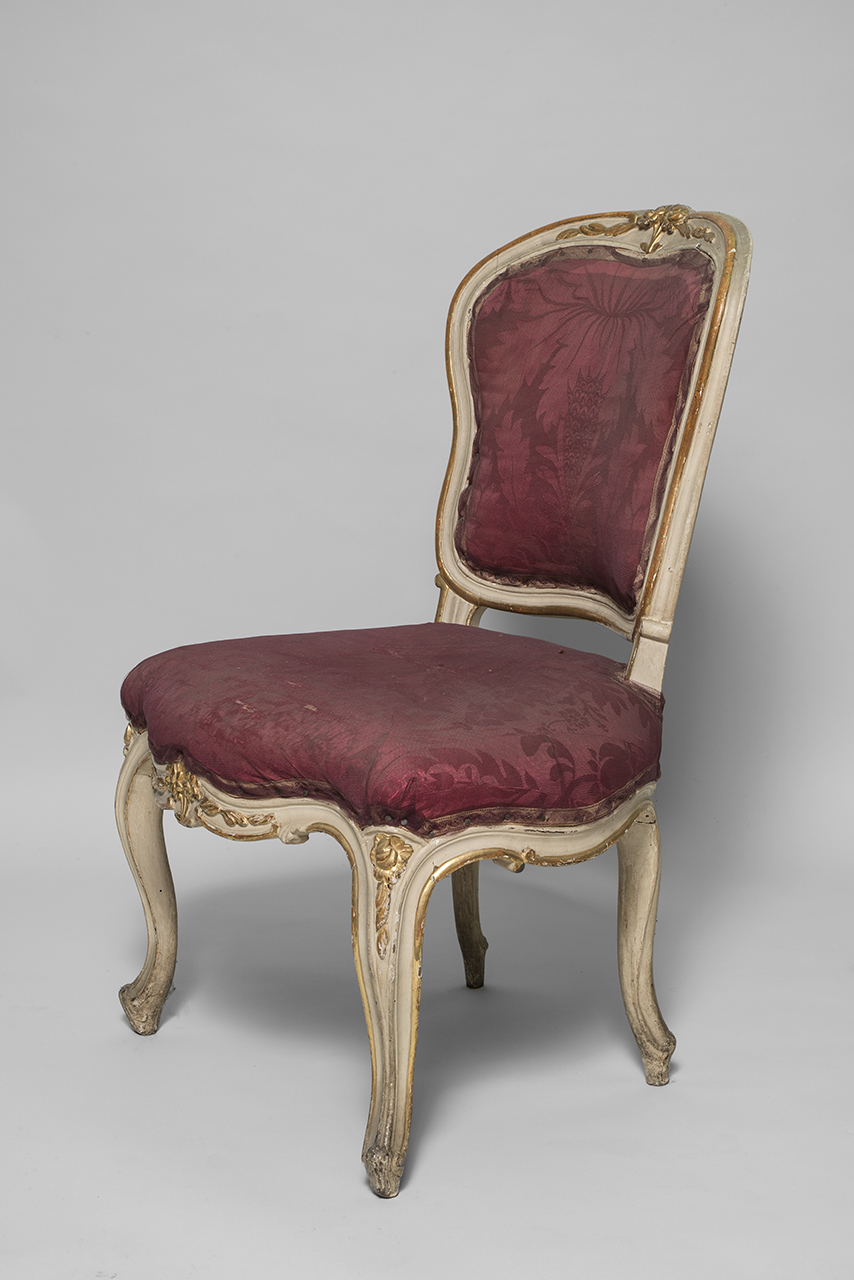 Sedia in legno intagliato e verniciato in bianco con filettatura in oro, imbottita e coperta al sedile e allo schienale di seta damascata a fiori e foglie su fondo rosso