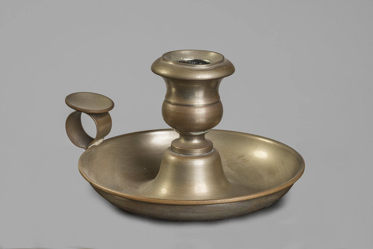 Bugia con base e manico rotondi. Il manico reca applicato un piccolo medaglione circolare