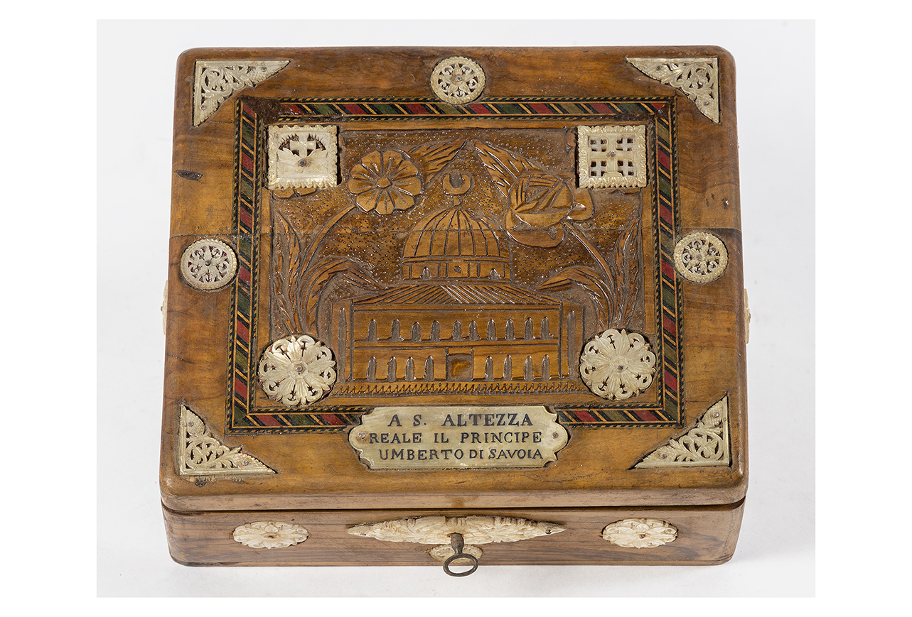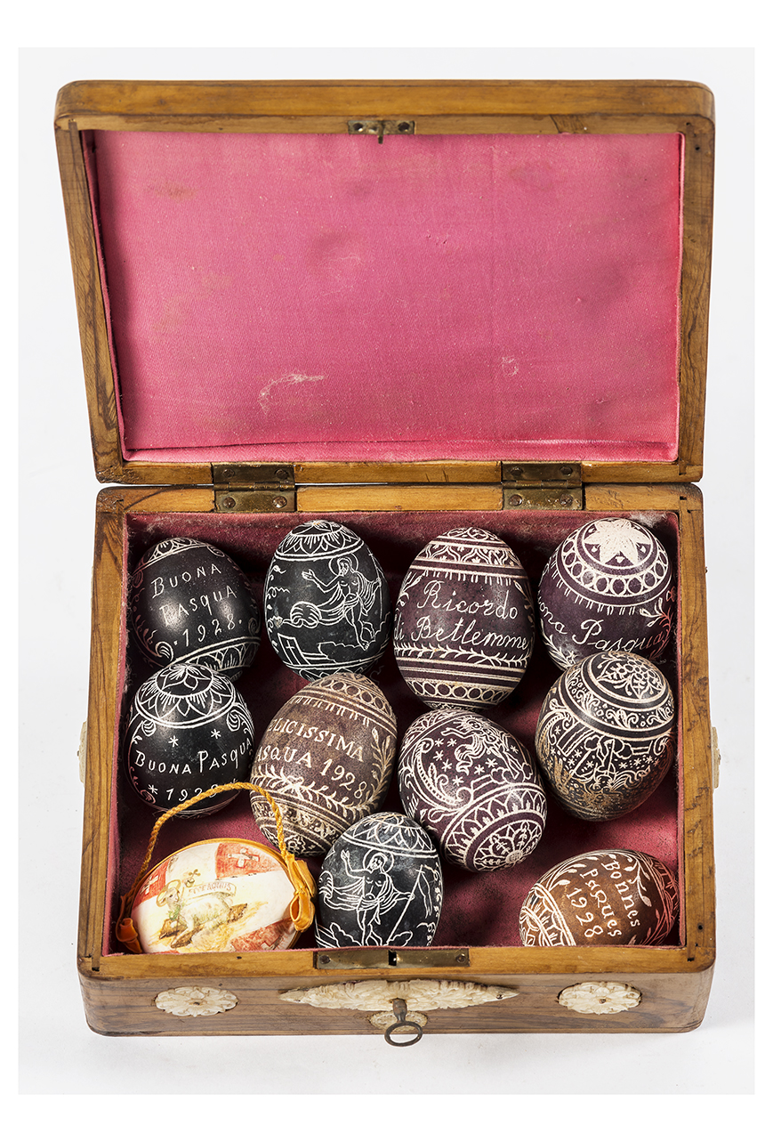 Cofanetto in legno d’ulivo dotato di serratura. Sul coperchio è intagliato il profilo della Moschea della Roccia di Gerusalemme, fra due grandi fiori, e vi sono applicazioni in madreperla incisa: quattro placchette triangolari, un medaglione con il simbolo dell’ordine francescano, a sinistra, quello della città di Gerusalemme, a destra e numerose rosette, che si ripetono anche sui lati. E' in madreperla anche la mostrina della serratura. E' internamente foderata in tessuto scarlatto e contiene undici uova dipinte con motti e simboli pasquali e la data del 1928