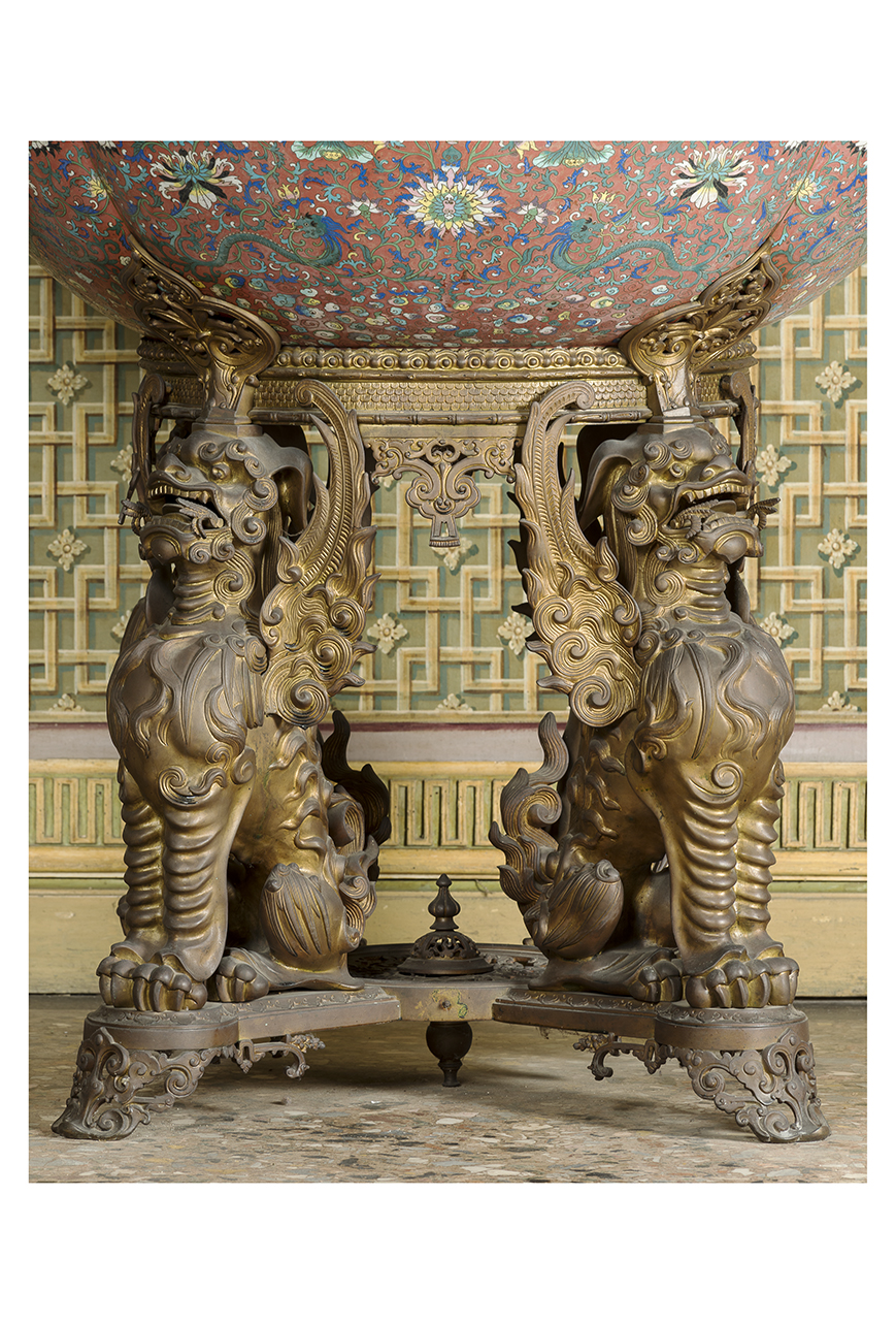 Grande vaso in bronzo, decorato a smalto cloisonnè a fondo rubino con draghi, pipistrelli, peonie, il nodo della fortuna cinese e altri elementi vegetali stilizzati. Il vaso è sorretto da un piedistallo composto da quattro animali fantastici, realizzati in bronzo a sbalzo, simili a dragoni alati