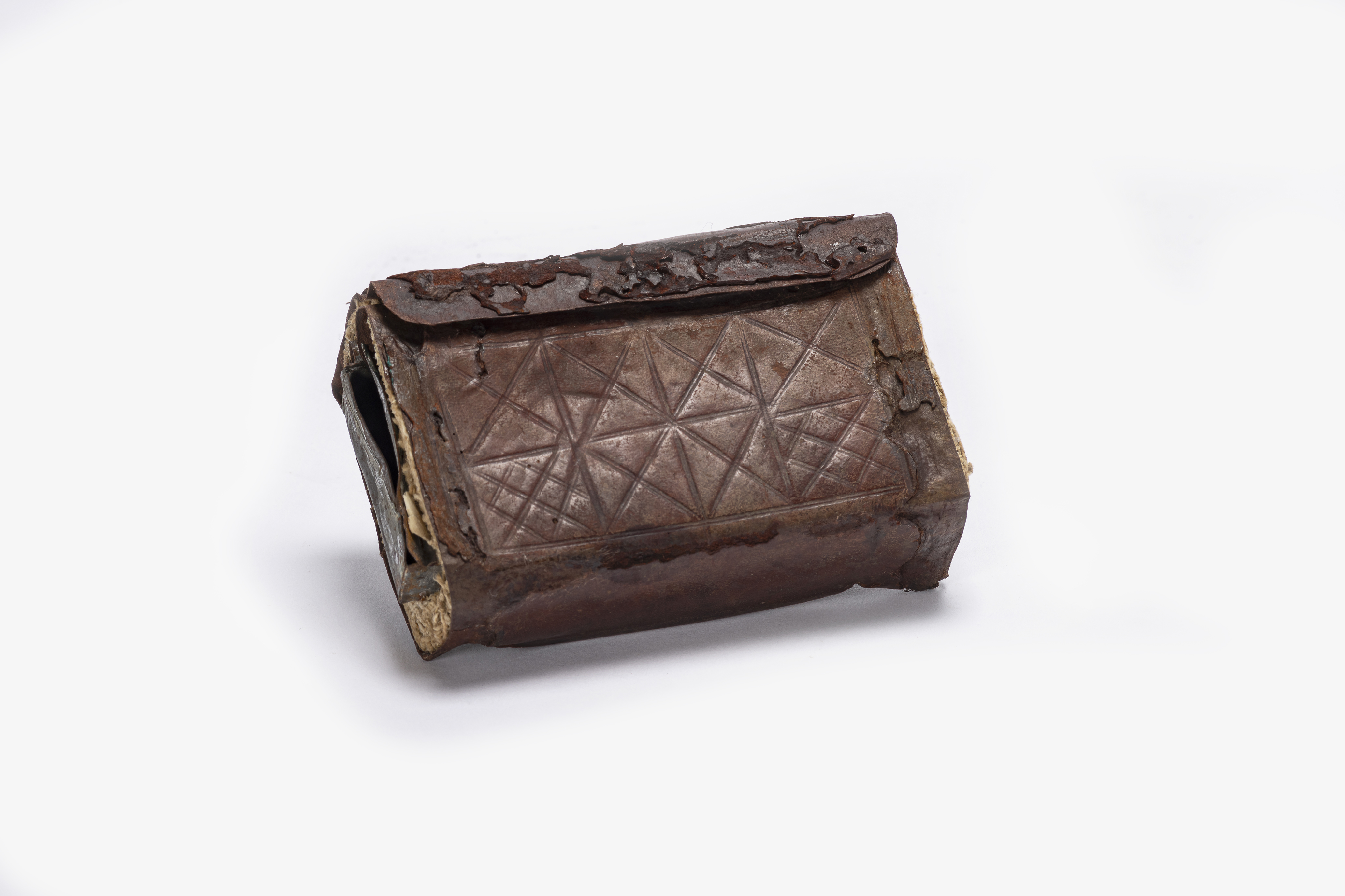 Scatolina con anima in metallo, ricoperto di cuoio impresso con due fiori circondati da due semicerchi. Al centro un elemento simile ad un'ancora