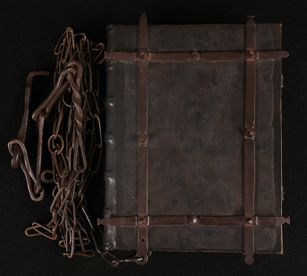 legatura rigida in pelle su assi in legno con catena; legatura di restauro con riapplicazione della pelle dei piatti originali, decorati a secco con cornice esterna di losanghe fiorite; cornice dello specchio di trilpo filetto con losanghe fiorite agli angoli e motivo di volute accantonato esterno al centro dei lati; al centro dello specchio mandorla mistilinea. Dorso di restauro. Tagli grezzi. Graffe e contrograffe in parte di restauro. Pergamena recuperata dal restauro applicata sul contropiatto superiore. Etichetta del laboratorio di restauro applicata sul contropiatto inferiore. Ferramenta e catena dell'originale legatura duecentesca