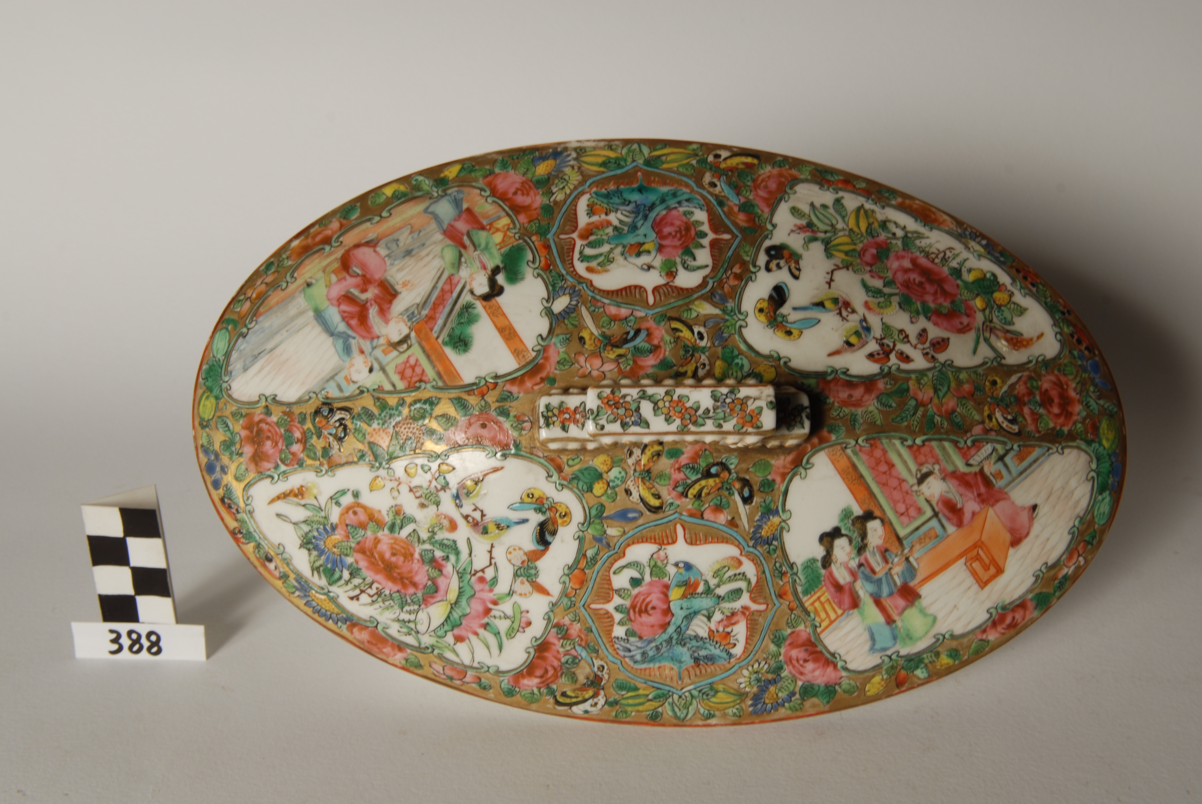 Zuppiera ovale con piede e coperchio. La zuppiera presenta una decorazione a fondo oro a chinoiserie con motivi ornamentali a fiori e farfalle intervallati da riquadri con cornici mistilinee che presentano nature morte e scene di vita quotidiana. Motivi decorativi a finti punzoni dorati sull'impugnatura del coperchio, sulle due impugnature laterali della zuppiera e sul piede