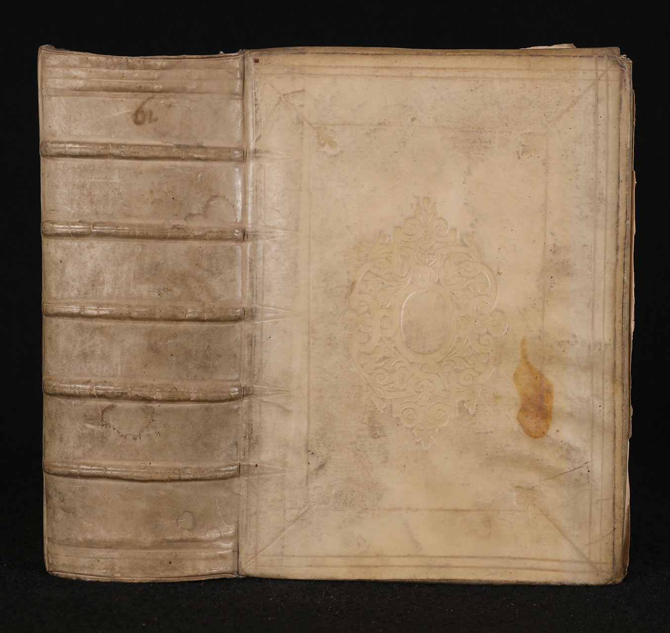 legatura rigida in pergamena su supporto in cartone, decorata ai piatti a secco con cornice esterna di doppio filetto, raccordata alla cornice dello specchio; cornice dello specchio di filetto, ferro a giglio accantonato interno; al centro dello specchio placca di volute e corolle. Dorso a cinque nervi doppi rilevati e sottolineati. Tagli spruzzati