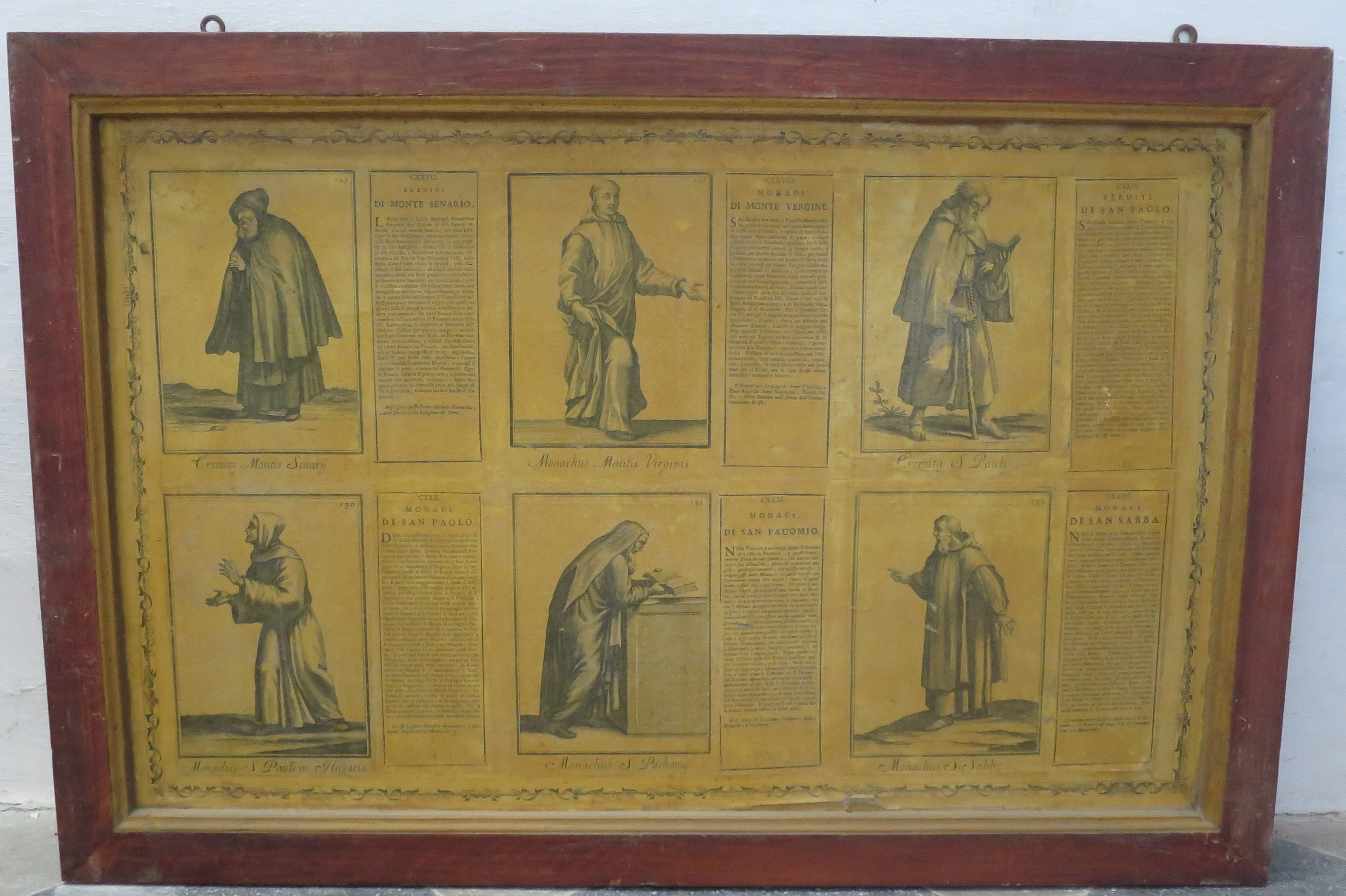 - NOTIZIE STORICO CRITICHE Il bene è stato composto applicando su tela, all'interno di un passepartout, alcune tavole a stampa provenienti dai quattro volumi del "Catalogo degli ordini religiosi della chiesa militante" di Filippo Bonanni. Il catalogo comprende n. 488 tavole incise su rame: n. 324 riguardano gli ordini religiosi, le restanti n. 164 sono relative gli ordini equestri e militari. Ad accompagnare le singole immagini vi sono anche dei testi di spiegazione in latino e italiano. Bonanni, con la sua opera, ha offerto un vasto repertorio iconografico corredato da un'interessante galleria di personaggi rappresentati nei loro tipici vestiari e suddivisi per genere: "Degli uomini religiosi" (vol. I); "Delle vergini a Dio dedicate" (vol. II); alcuni ordini tralasciati, diversi collegi di alunni e congregazioni di fanciulle (vol. III); "Ordini equestri e militari" (vol. IV). La prima edizione di questi quattro volumi venne pubblicata da Antonio De Rossi nel 1706-1711, successivamente vi furono altre edizioni curate da Giorgio Placho. Il montaggio di stampe in oggetto è parte di una serie di n. 54 quadri ottenuti secondo la metodologia compositiva sopradescritta e aventi tutti le stesse dimensioni. A eccezione dell’assemblaggio con frontespizio (cfr. scheda n. 449279), non è possibile stabilire quale edizione dell'opera di Bonanni sia stata usata per i singoli montaggi