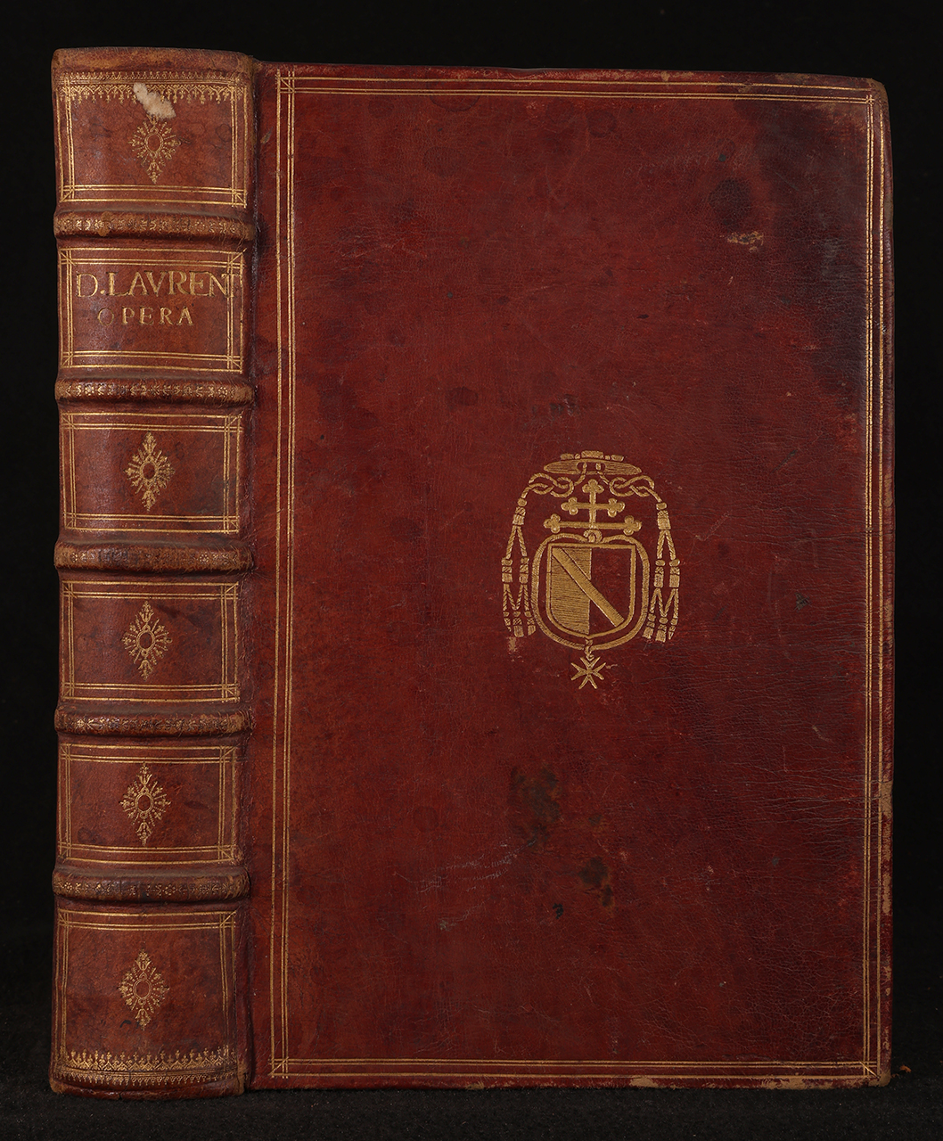 Legatura rigida in pelle su supporto in cartone, decorata ai piatti in oro con cornice esterna di filetto, raccordata alla seconda cornice di doppio filetto; al centro dello specchio arma vescovile. Dorso a cinque nervi rilevati e sottolineati; caselle decorate in oro, autore e titolo breve impressi in oro in seconda casella. Tagli grezzi. Ex libris a stampa applicato sul contropiatto superiore