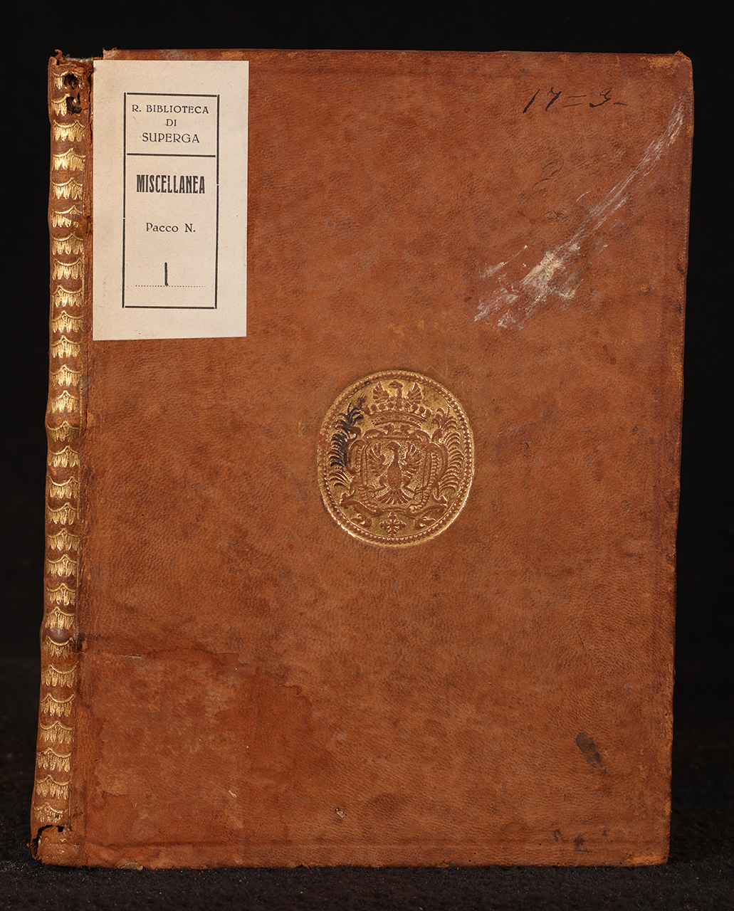 Legatura rigida in pelle su supporto in cartone decorata in oro con arma gentilizia in ovale di filetto al centro dello specchio. Dorso liscio decorato in oro. Tagli rossi. Nota manoscritta sul contropiatto superiore coperta da ex libris. Annotazione manoscritta sul verso del foglio di guardia superiore