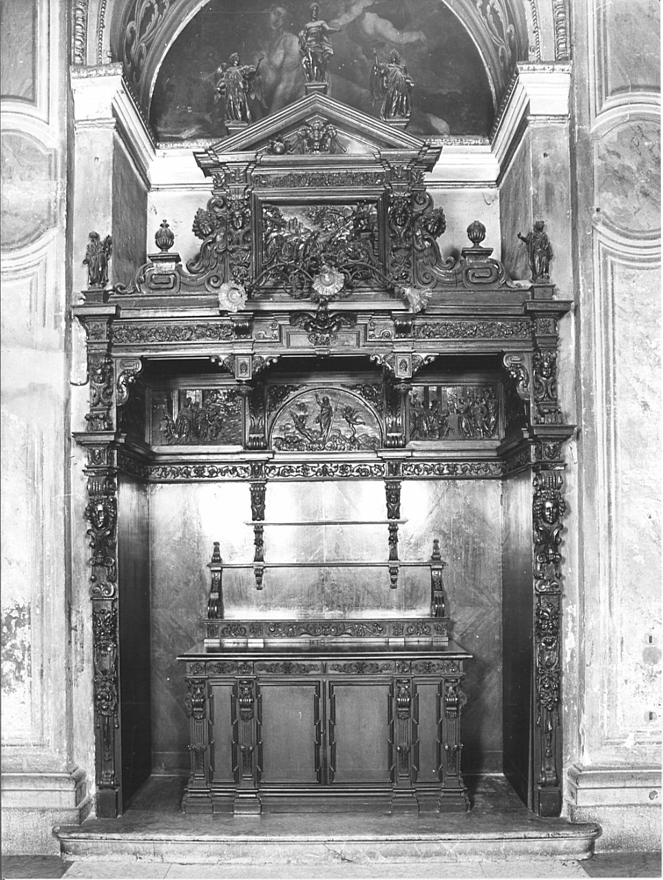 - NOTIZIE STORICO CRITICHE Veniva adoperata fino a poco tempo fa nelle cerimonie dei battesimi, adornata coi piatti d'argento cinquecenteschi. Appare molto simile per lo stile, il materiale, le decorazioni ai coevi confessionali della chiesa. L'uso della credenza (mobile assai raro nel seicento e settecento, più comune nell'ottocento), si diffonde dopo il concilio di Trento in rapporto con lo spirito liturgico della così detta Controriforma. Non si hanno notizie documentate sull'autore del mobile. In un manoscritto recente nell'archivio parrocchiale vengono considerati opera di Carlo Garavaglia, autore quasi certo di due confessionali e pulpito di pietre dure, ma senza alcun documento originale. Probabilmente venne realizzato attorno al 1630, quando nella chiesa, rifatta la cupola pericolante, si officia pubblicamente per la prima volta