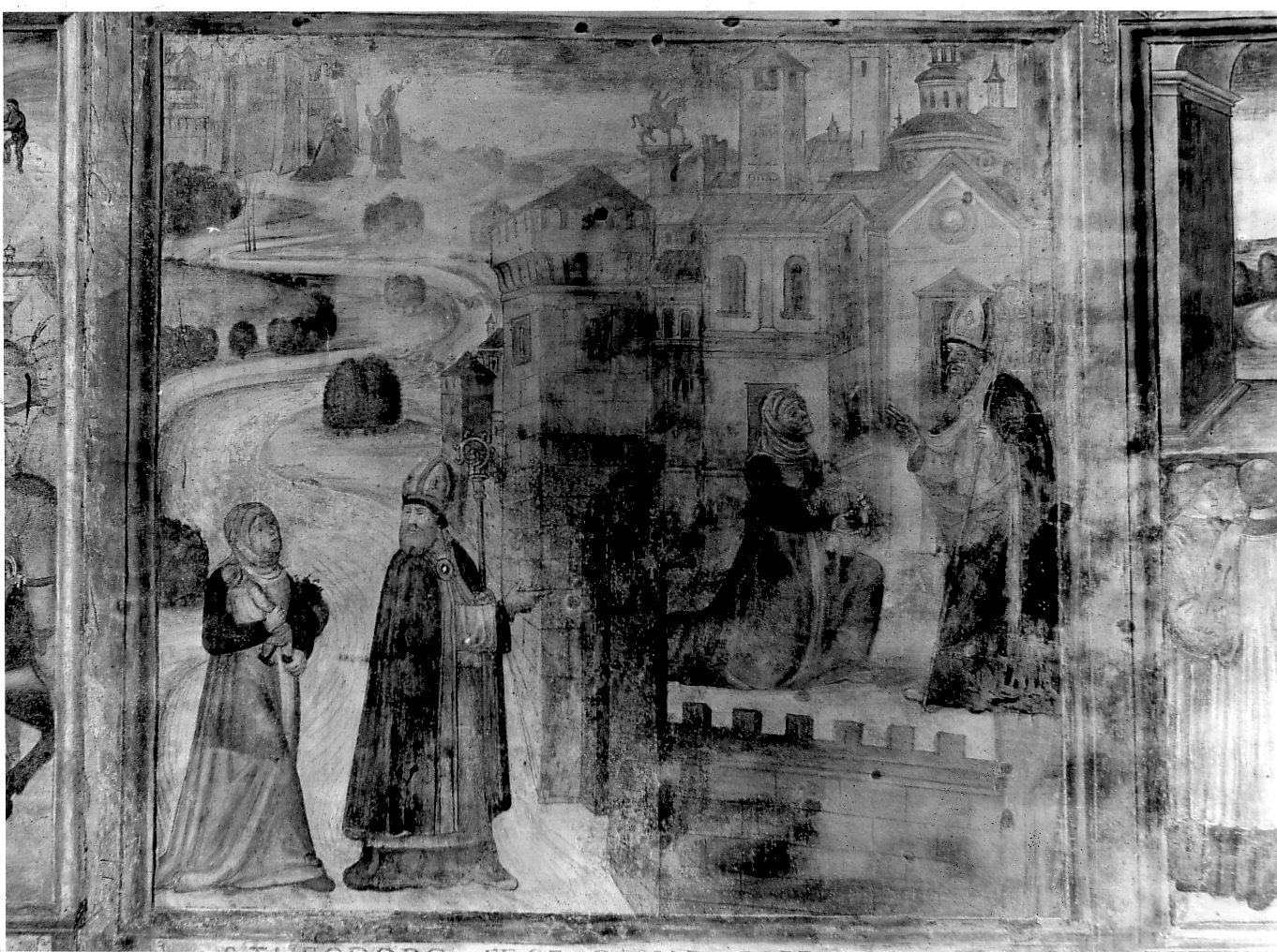 - ISCRIZIONI sotto il riquadro - S.THEODORO FECE PASSAR SOPRA LAQUA DE/ TICINO LAVIDUA DE CASTRONOVO ET/ LIBERO SUO FIGLIOLO PARALITICO - a pennello -