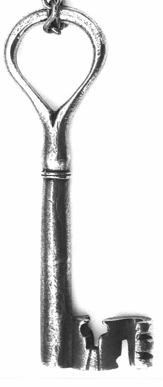 Serratura tuttora (anni '70 del XX sec.) funzionante, incorporata alla parte apribile della porta. Chiave in ferro battuto con impugnatura a cerchio inflesso nella parte inferiore