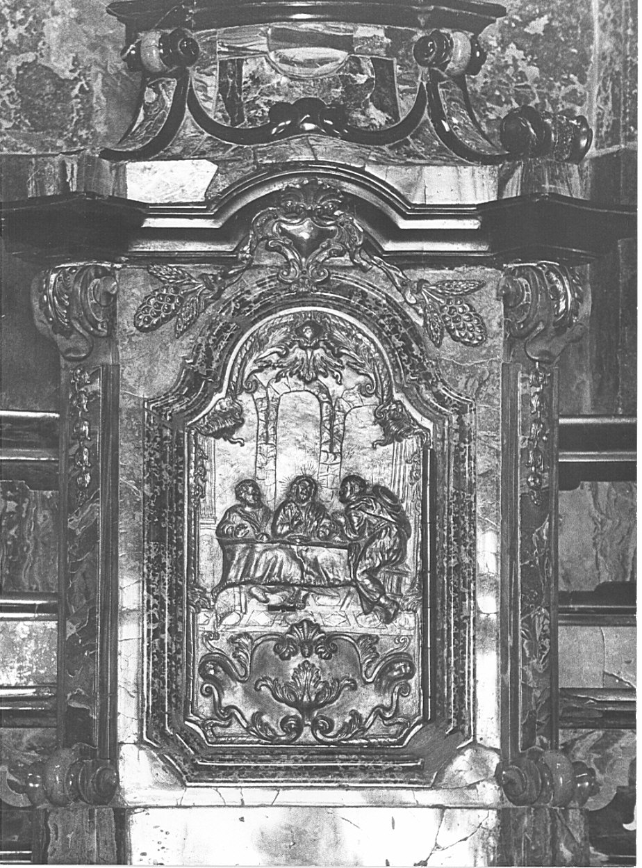 - NOTIZIE STORICO CRITICHE La raffigurazione della Cena in Emmaus sulle porte dei tabernacoli è soggetto presente nella liturgia ambrosiana tra la fine del Seicento e la metà del Settecento. Dati quindi i caratteri dell'altare è presumibile si tratti di opera collocabile nella prima metà del secolo XVIII