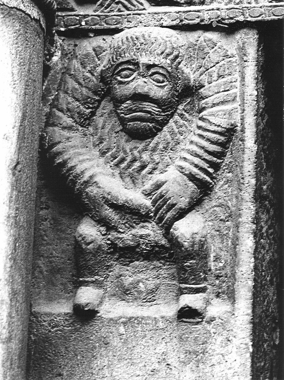- NOTIZIE STORICO CRITICHE La cariatide è strettamente legata all'architrave considerato dagli studiosi uno dei risultati più interessanti della scuola milanese del XII secolo. I caratteri espressi da una rozza esecuzione, dalla sproporzione di alcune parti del corpo, dalla durezza del panneggio eseguito a grosse canne o con rigide pieghettature a zig-zag indicano un momento avanzato della scultura romanica in Lombardia, come hanno concordemente affermato gli studiosi, dal Porter, De Dartein, all'Arslan