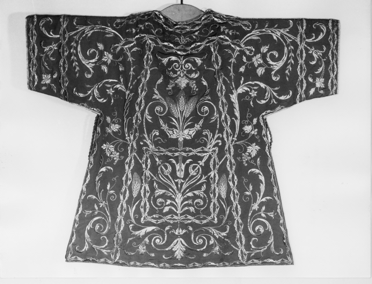 Fondo di raso cannettato in seta rossa ricamato con oro filato e lamellare. Il disegno si articola in volute fronzute, girali e delicati motivi floreali. Al centro, tre spighe e un mazzo entro un vaso stilizzato. In luogo dei galloni di bordura e di separazioni delle varie parti, ricamo a doppia serpentina. Fodera in seta rosso cardinale