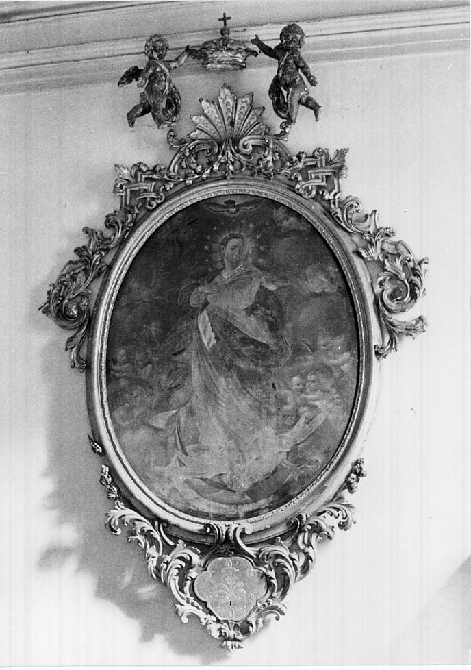 Cornice di quadro di forma ovale in legno dorato con fogliami e festoni di frutta che si appoggiano su elementi geometrici culminanti in una conchiglia stilizzata sopra la quale svolazzano due puttini che reggono una corona. Nella parte bassa i fogliami incorniciano una portella reliquiario